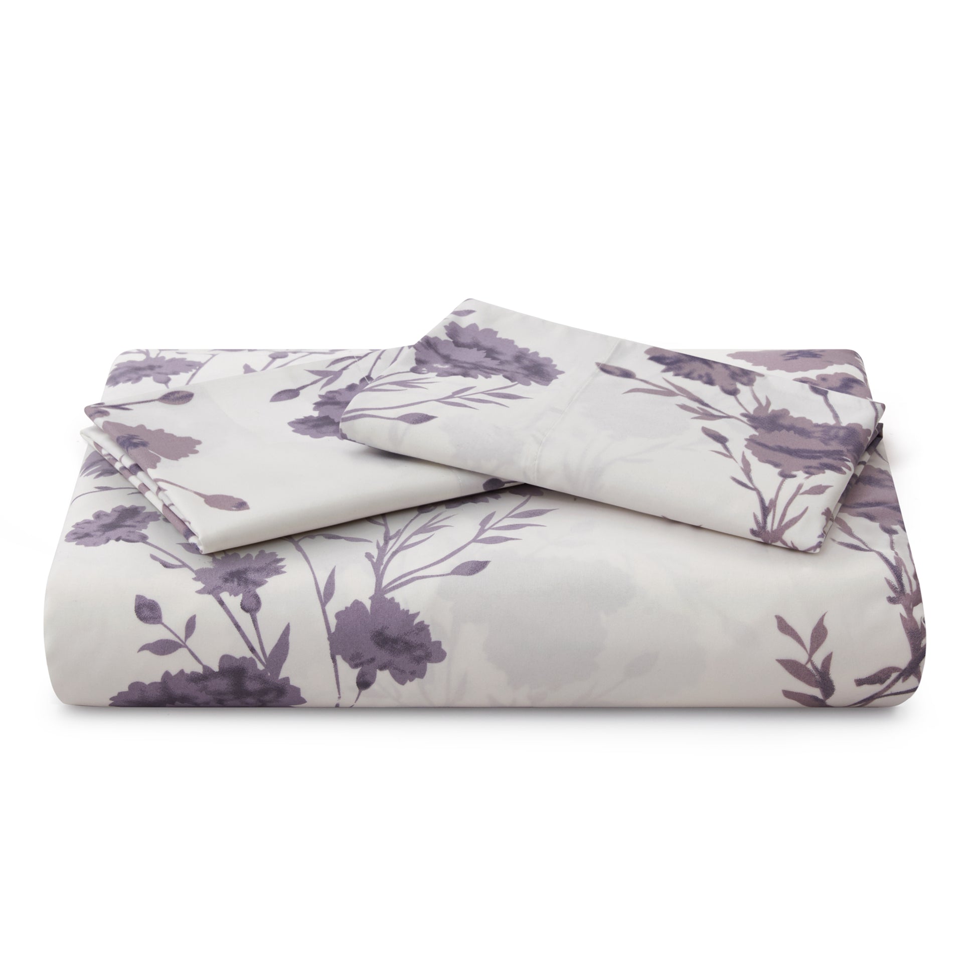 Design - Modern Flowers Patterns Have White Base with Purple Carnation Flower Leaves Branch Decorated on It. Printed Matching Design on the 2 Pillowcases. Our 120 GSM Double Brushed Polyester and Rayon from Bamboo is Soft and Durable and Features a Breathable Weave