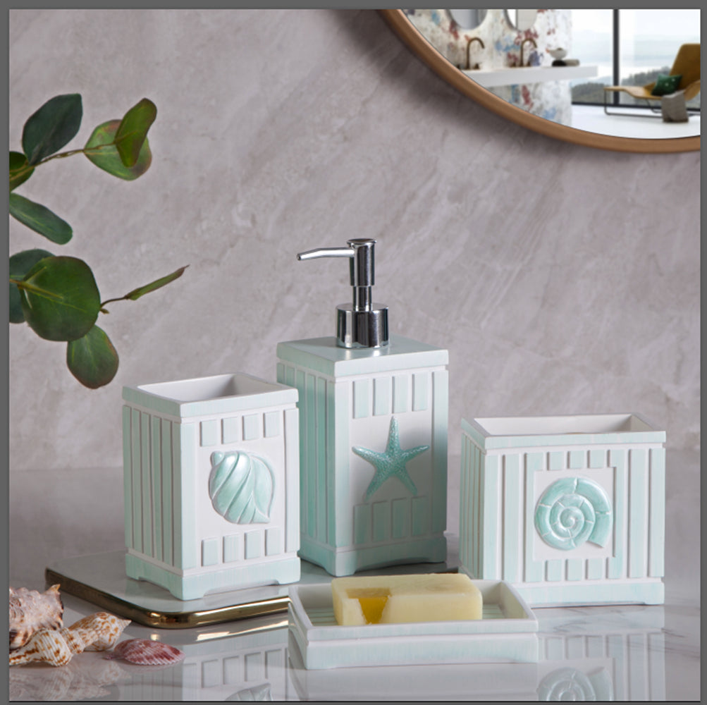 Modern Luxury Décor Bath Accessory Ensemble Bathroom Lotion Dispenser Toothbrush Holder Tumbler Soap Dish, Marina Green Beach