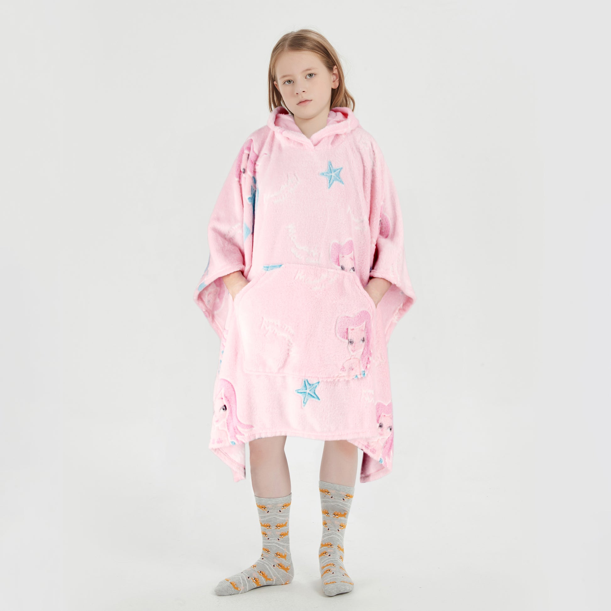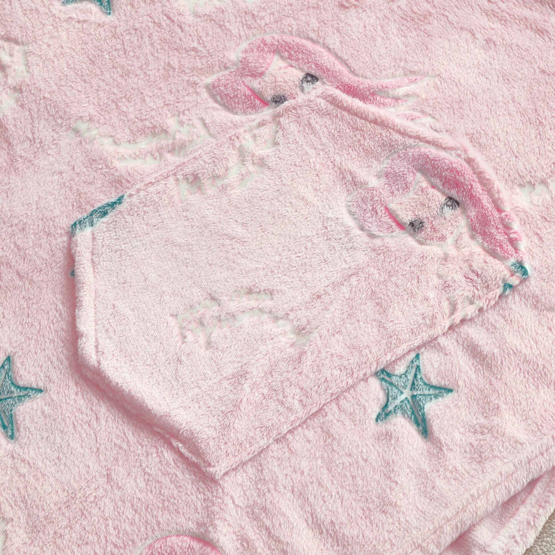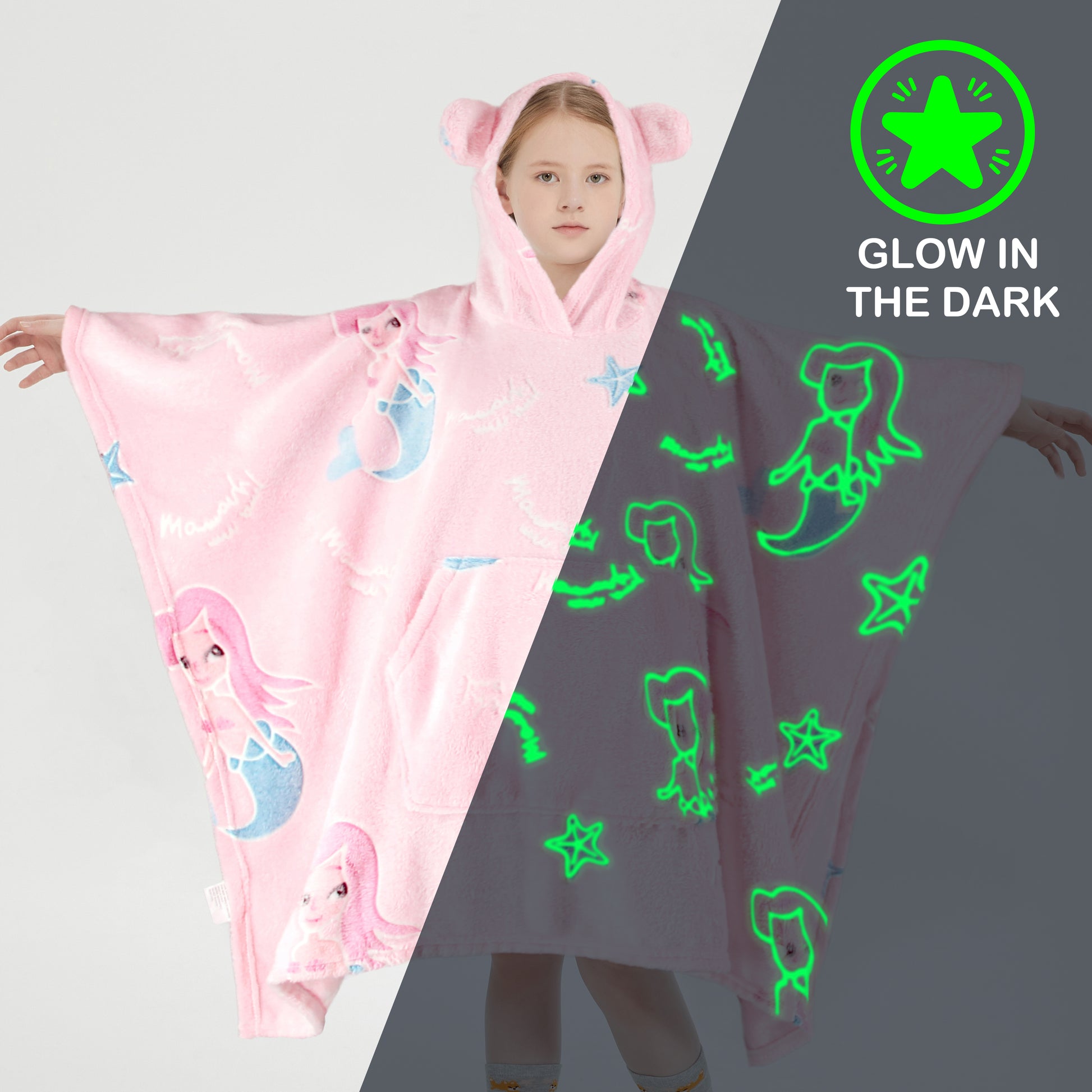 Glow in the Dark Kids Wearable Hoodie Blanket for Girls Soft Warm Flannel Fleece Hooded Sweatshirt, 110 x 75 cm Pink Mermaid