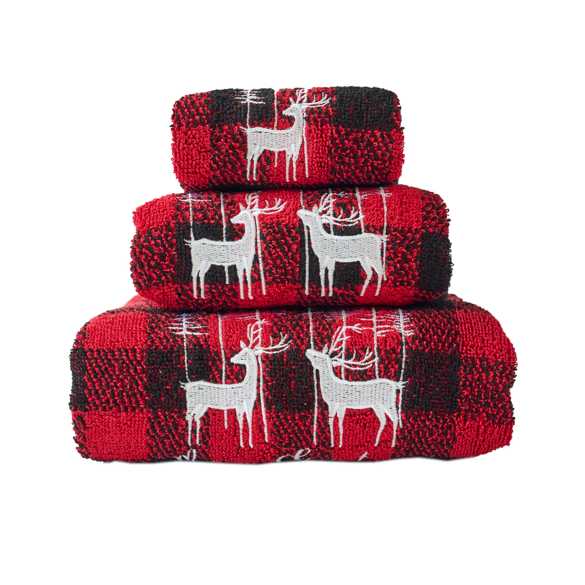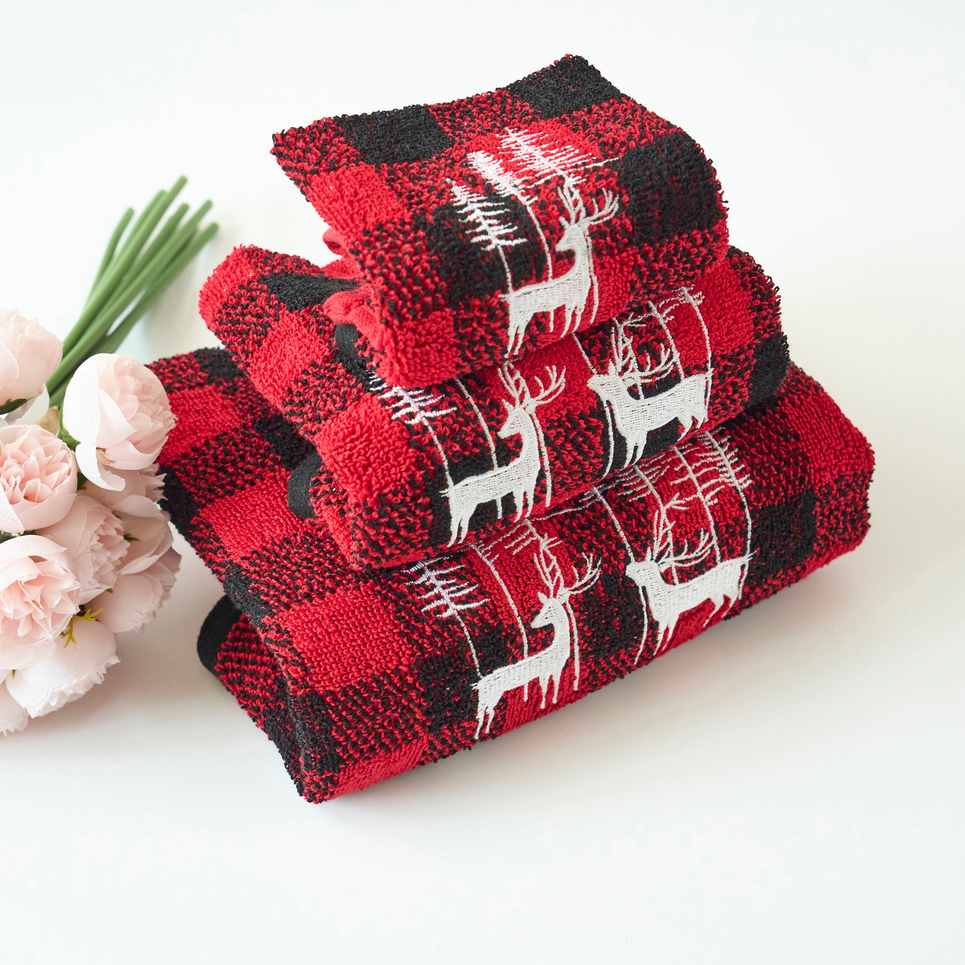 Christmas Premium Decor Soft 100% Cotton Embroidered Bathroom Modern 3 Piece Towel Set, Red Black Plaid Xmas Reindeer and Tree