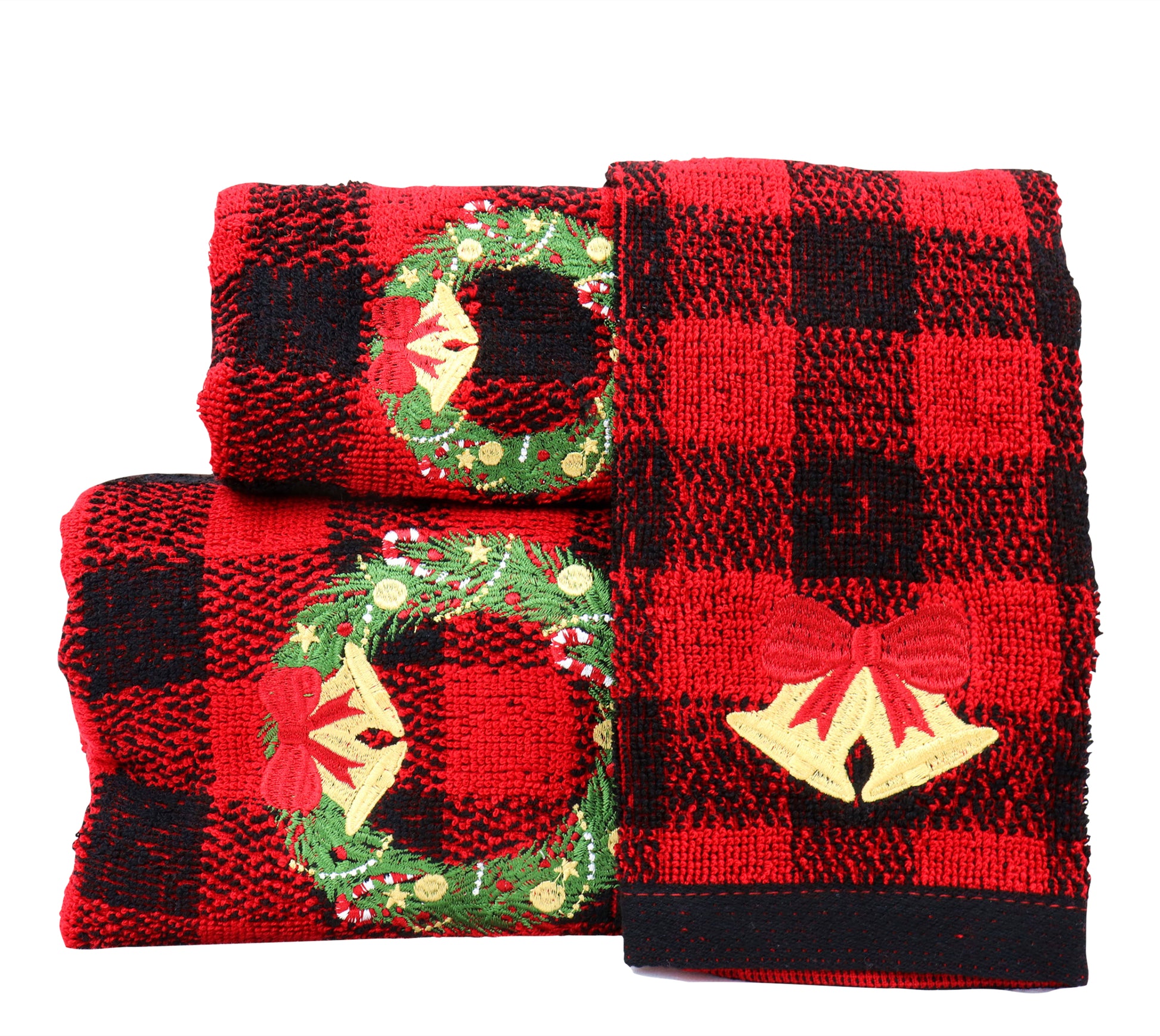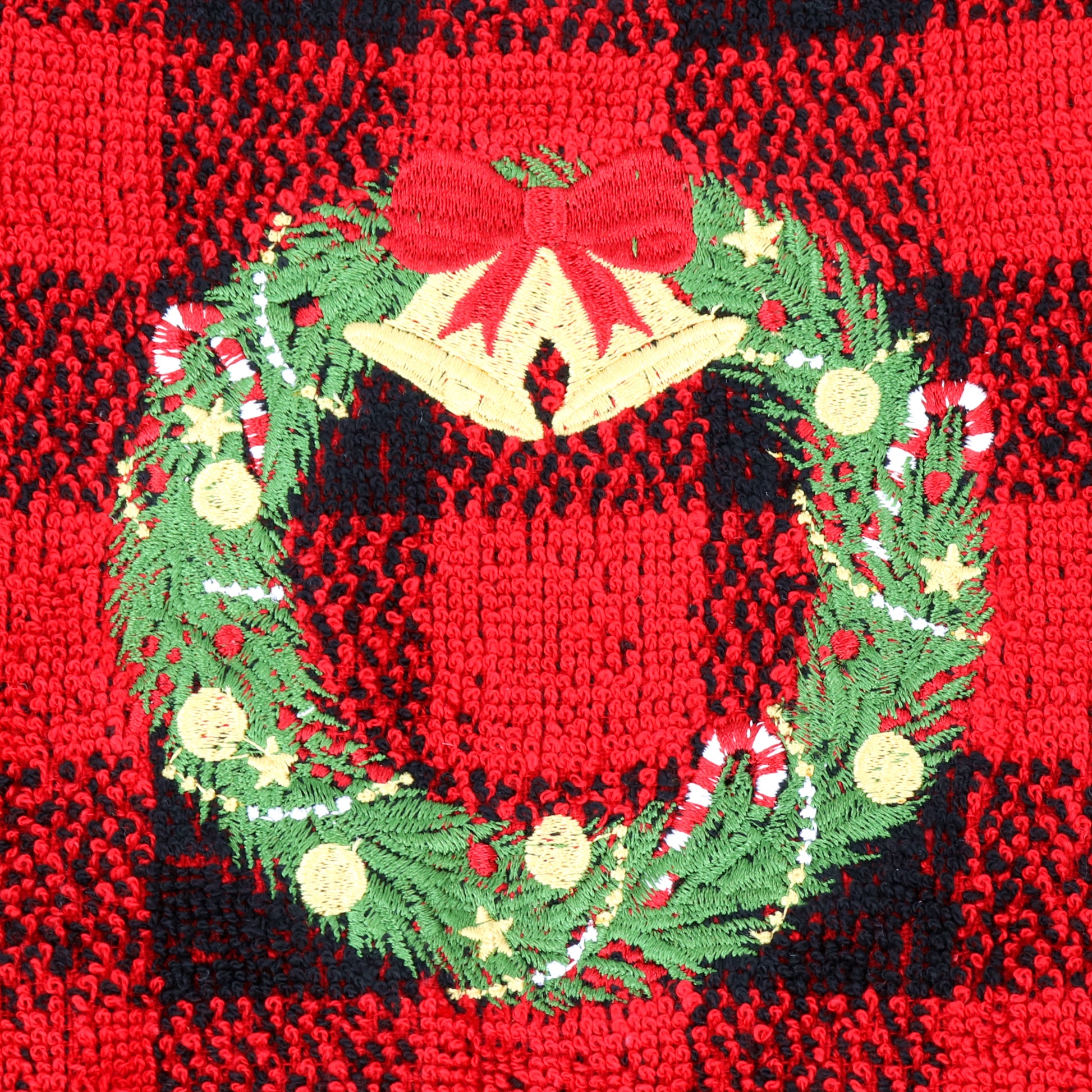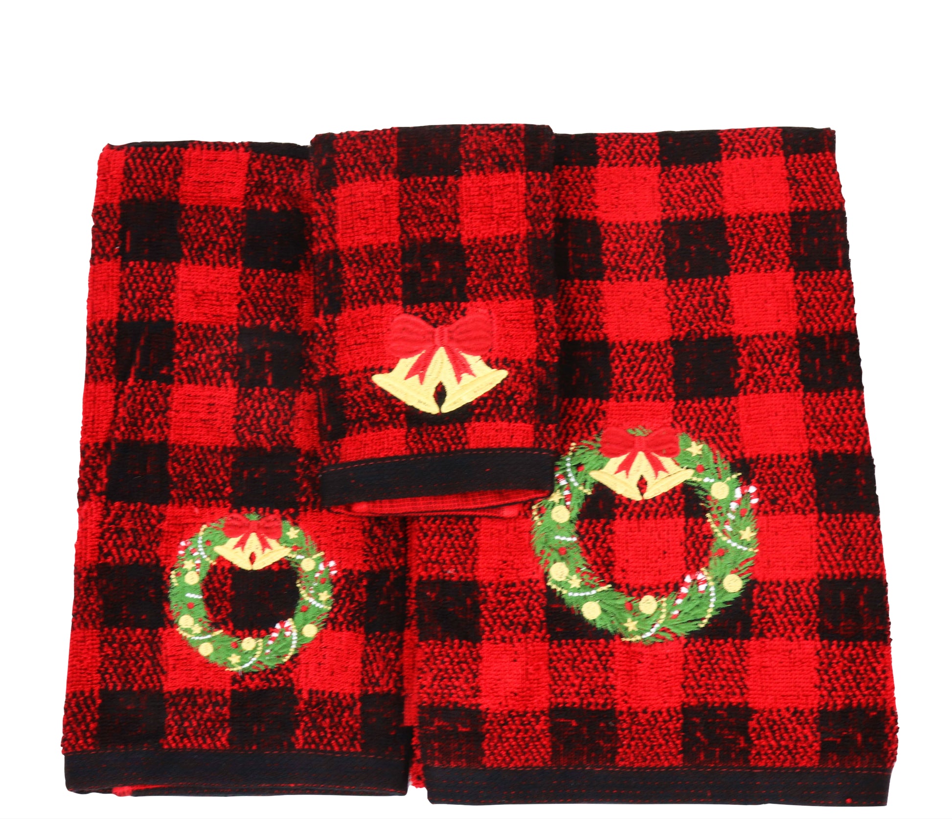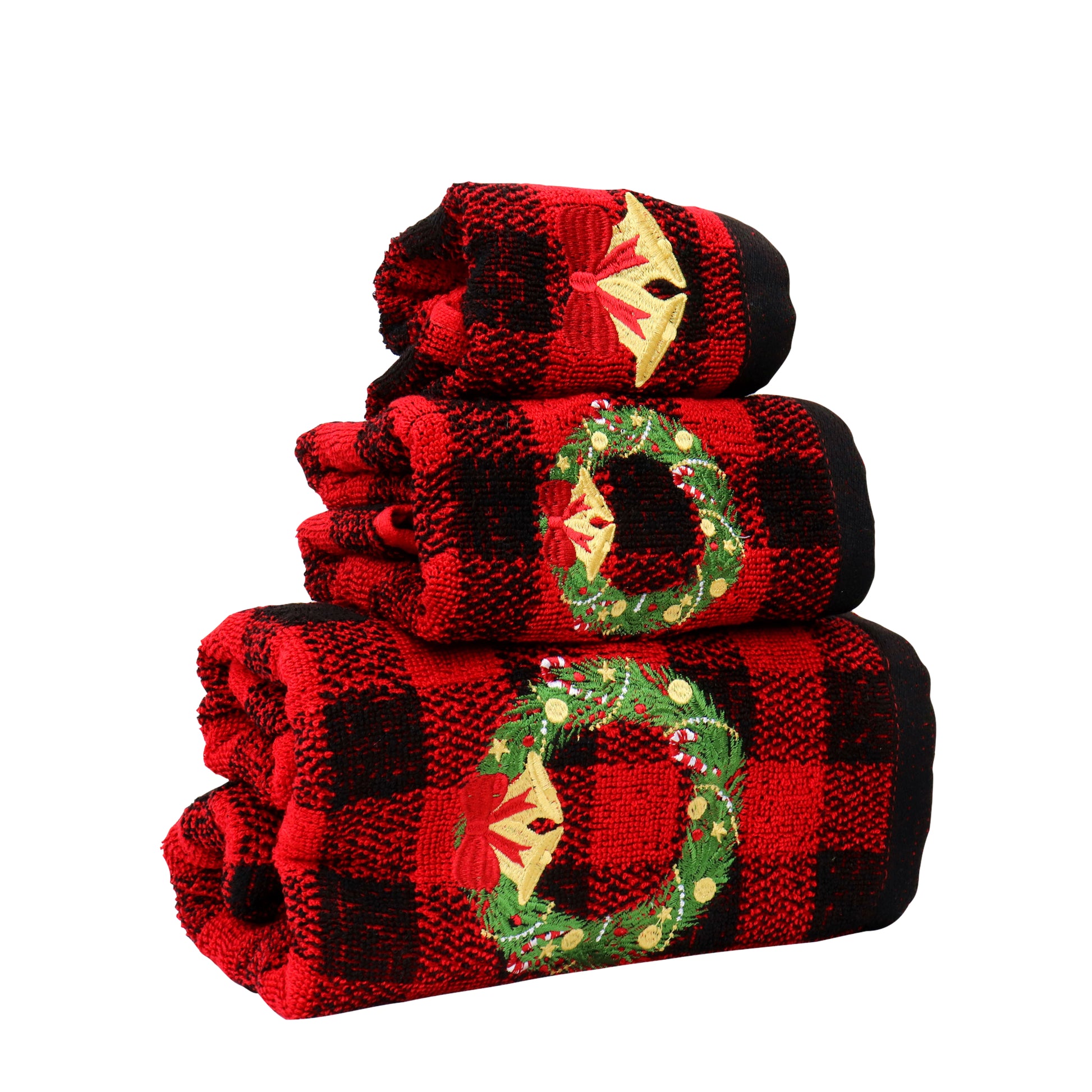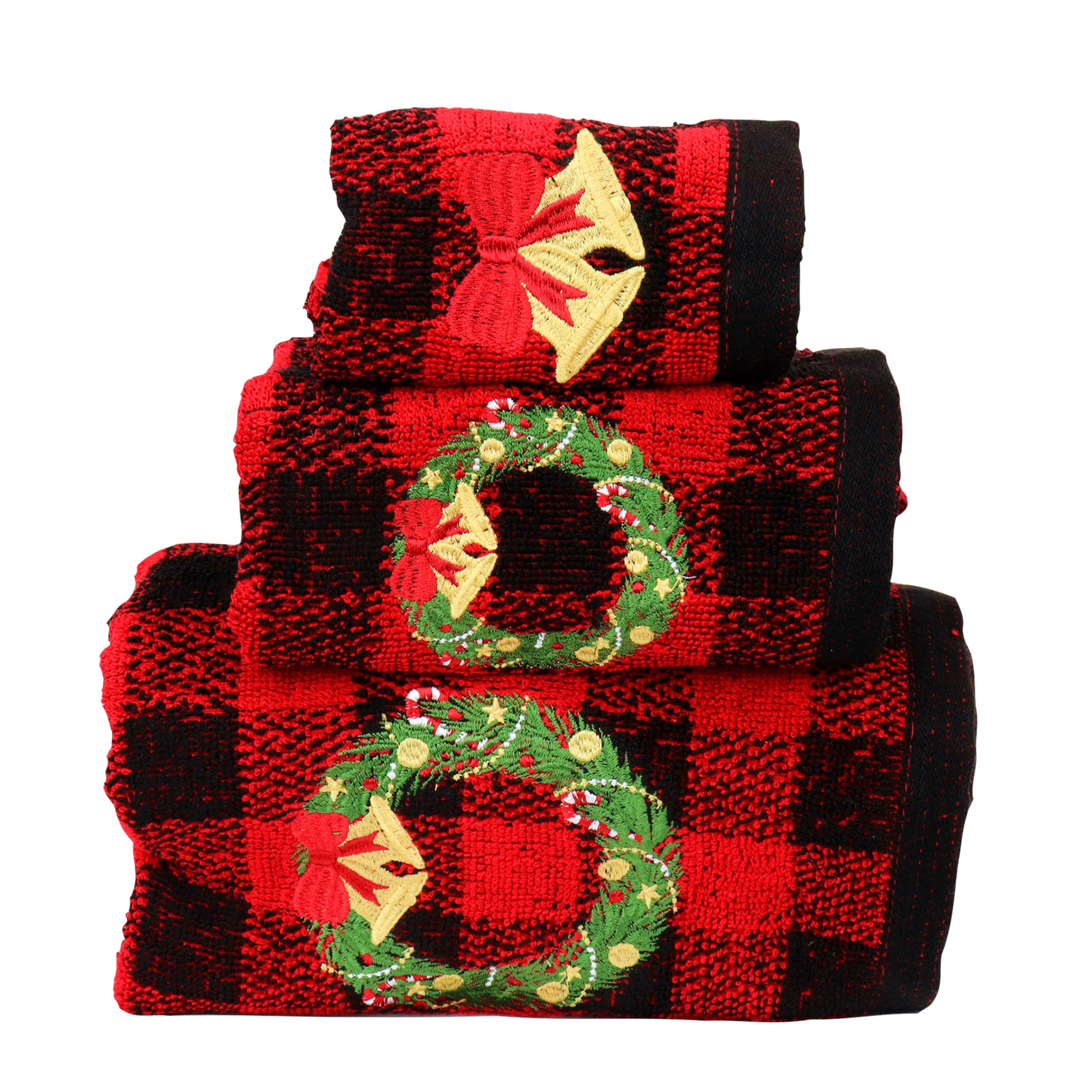 Christmas Premium Decor Soft 100% Cotton Embroidered Bathroom Modern 3 Piece Towel Set, Red Black Plaid Xmas Wreath