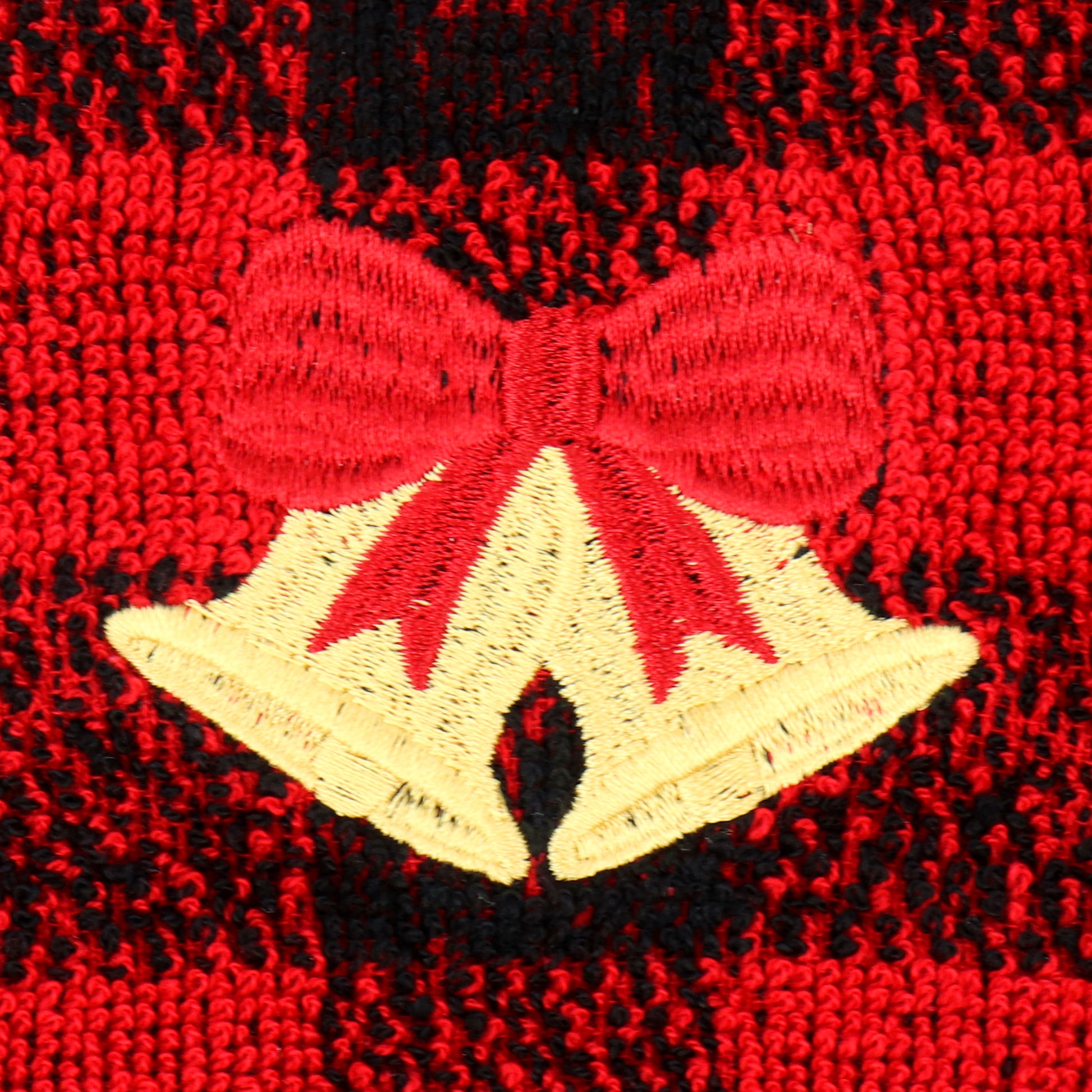 Design - This Modern Christmas Towel Set Decorated with Christmas Green Holly Wreath Have Jingle Bell, Red Bow Tie, Cane Candy, Star, Light and Ornaments on It with Red and Black Check Gingham Checkered Plaid Base