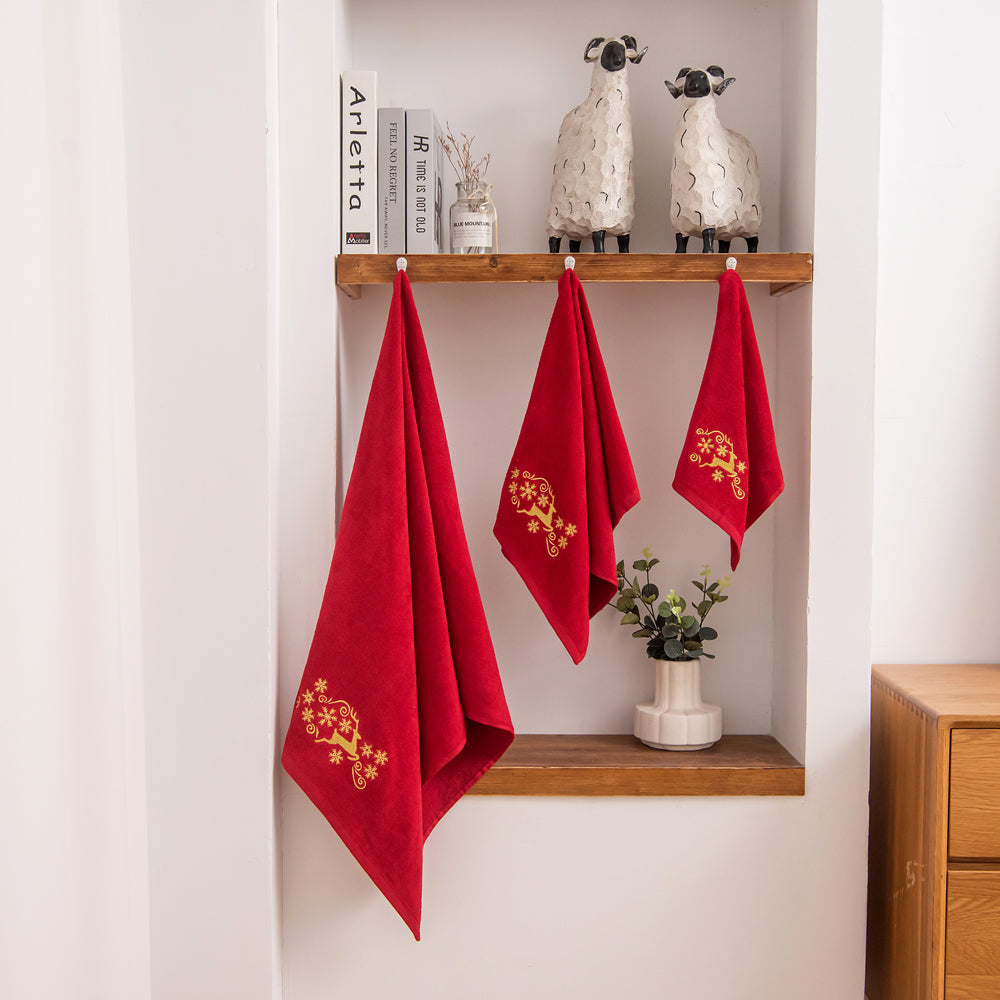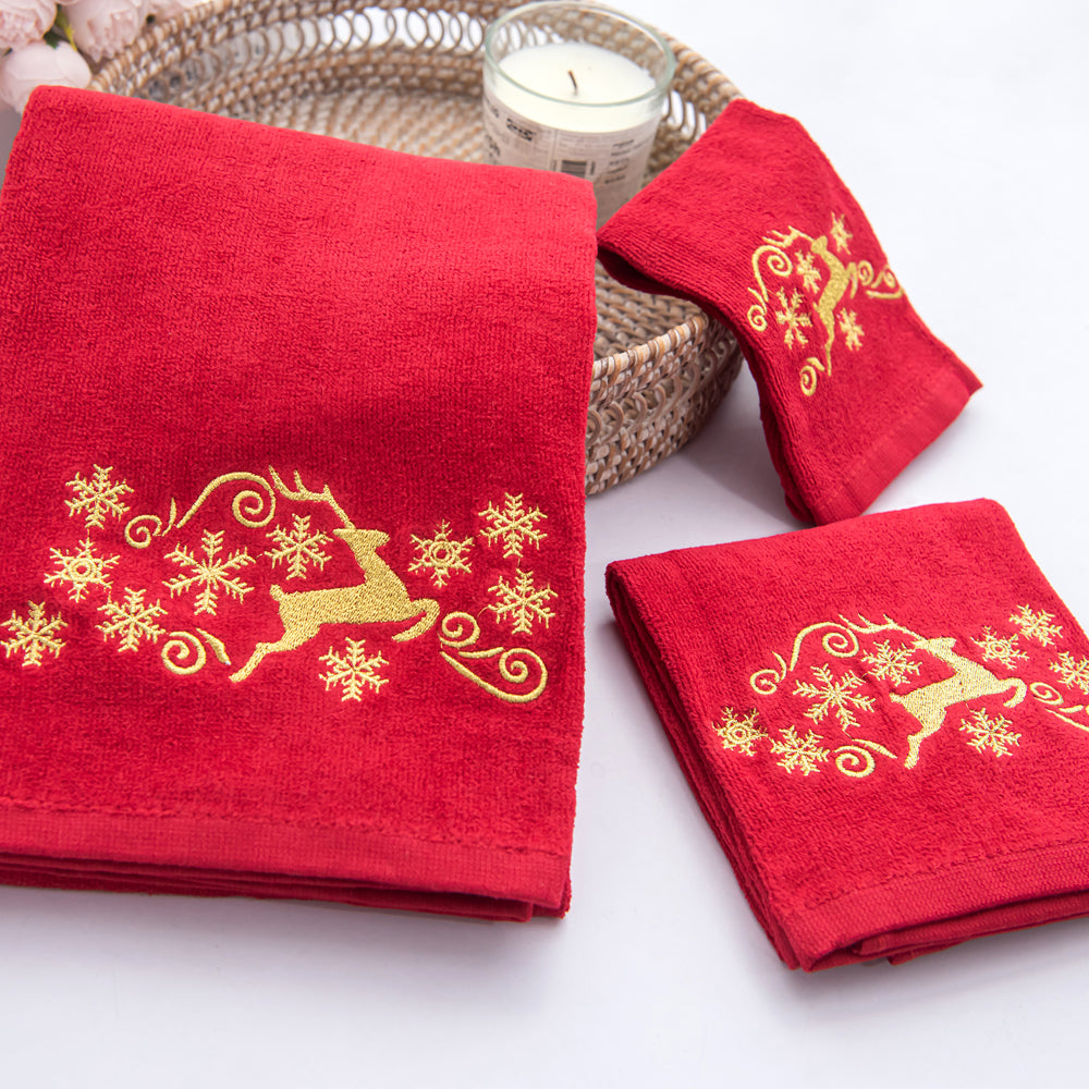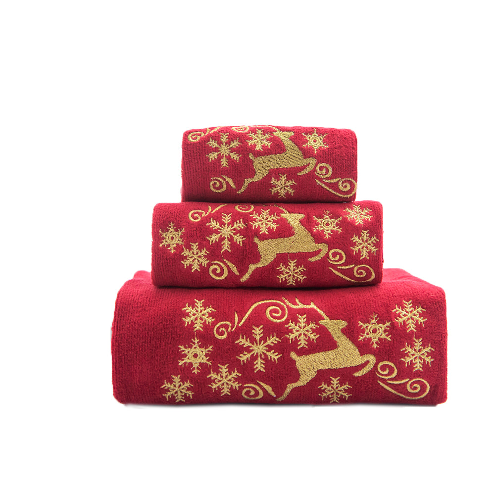 Premium Luxury Xmas Decor Soft 100% Cotton Embroidered Bathroom Christmas 3 Piece Towel Set, Gold Deer