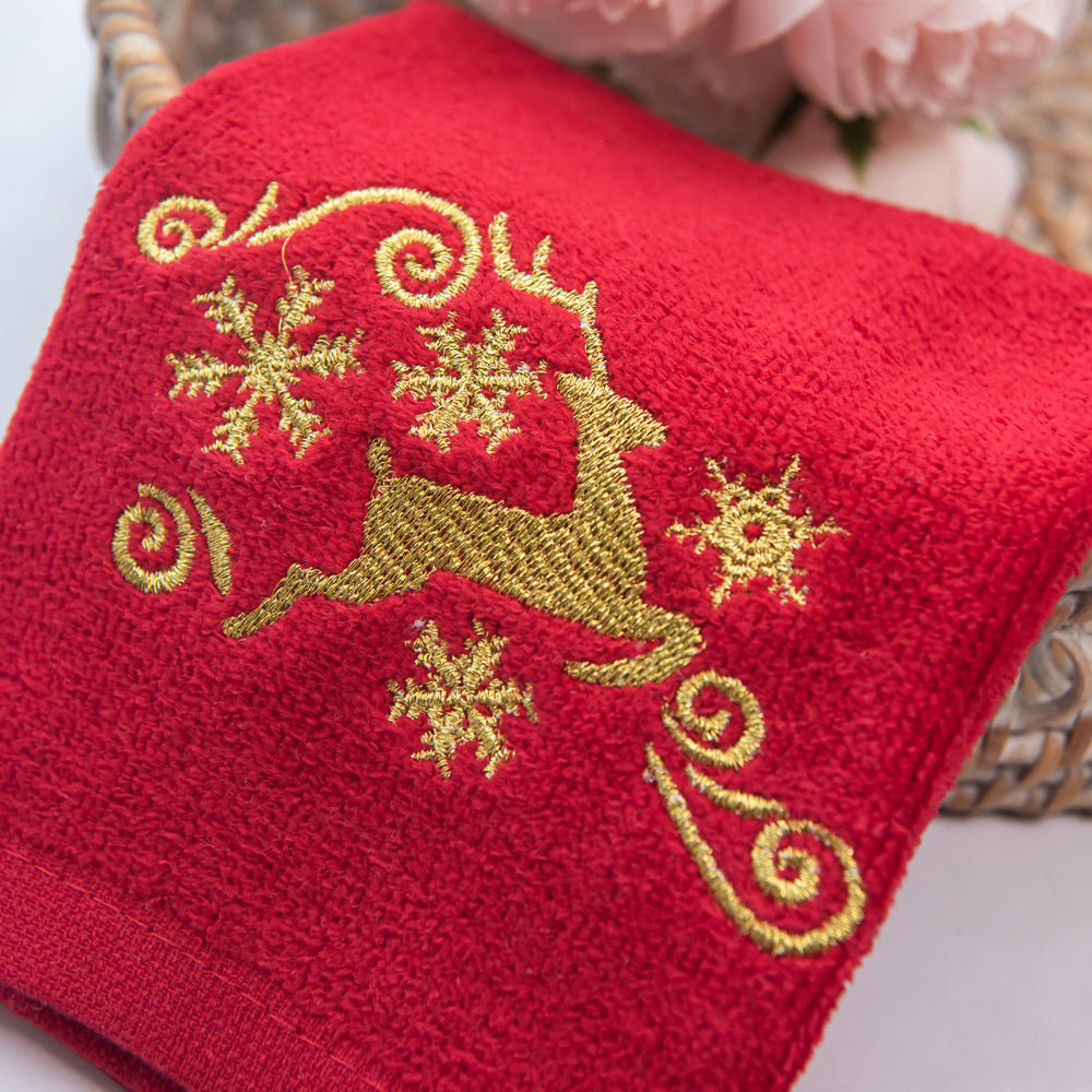 Design - This Modern Christmas Towel Set Decorated with Gold reindeer and Snowflake with Red Base