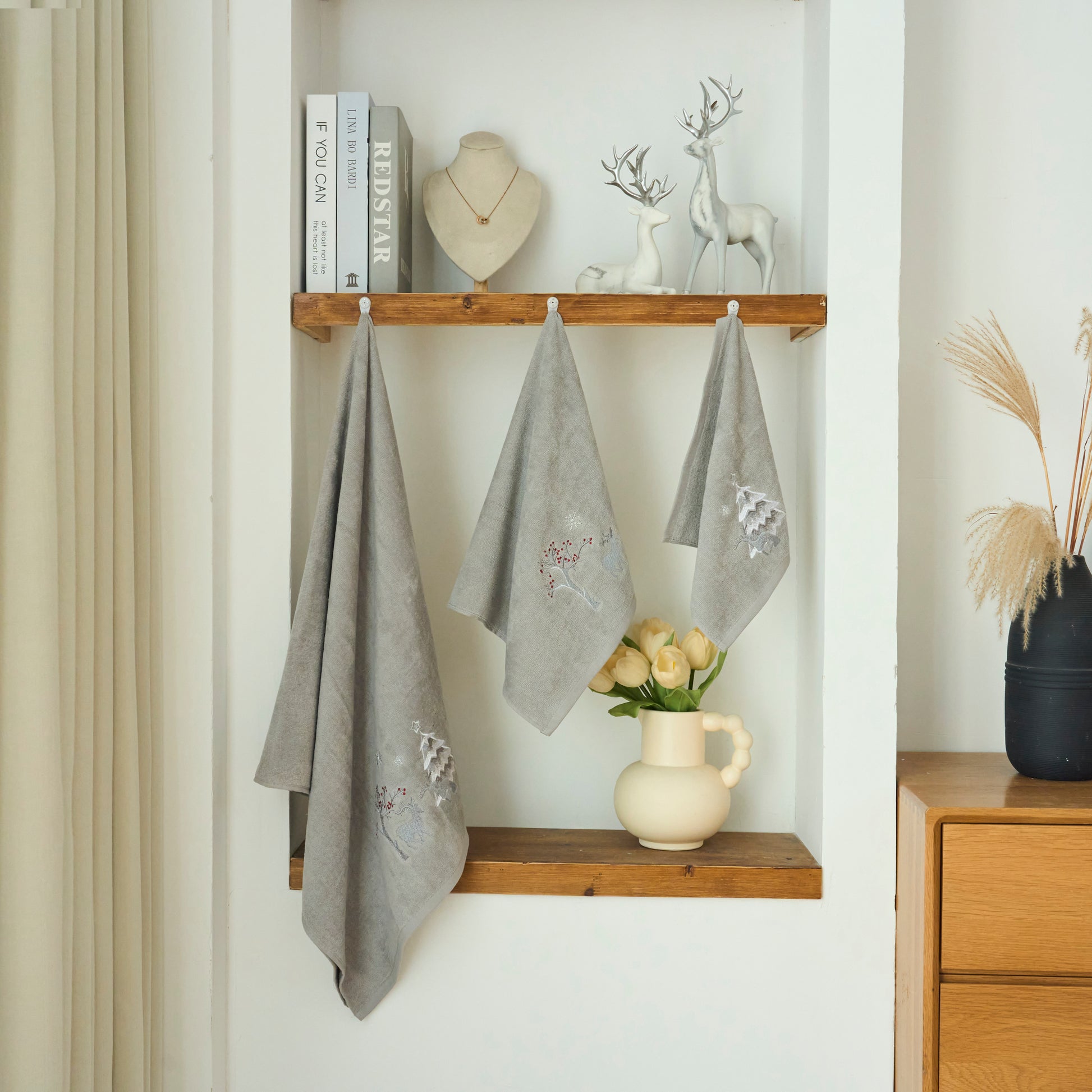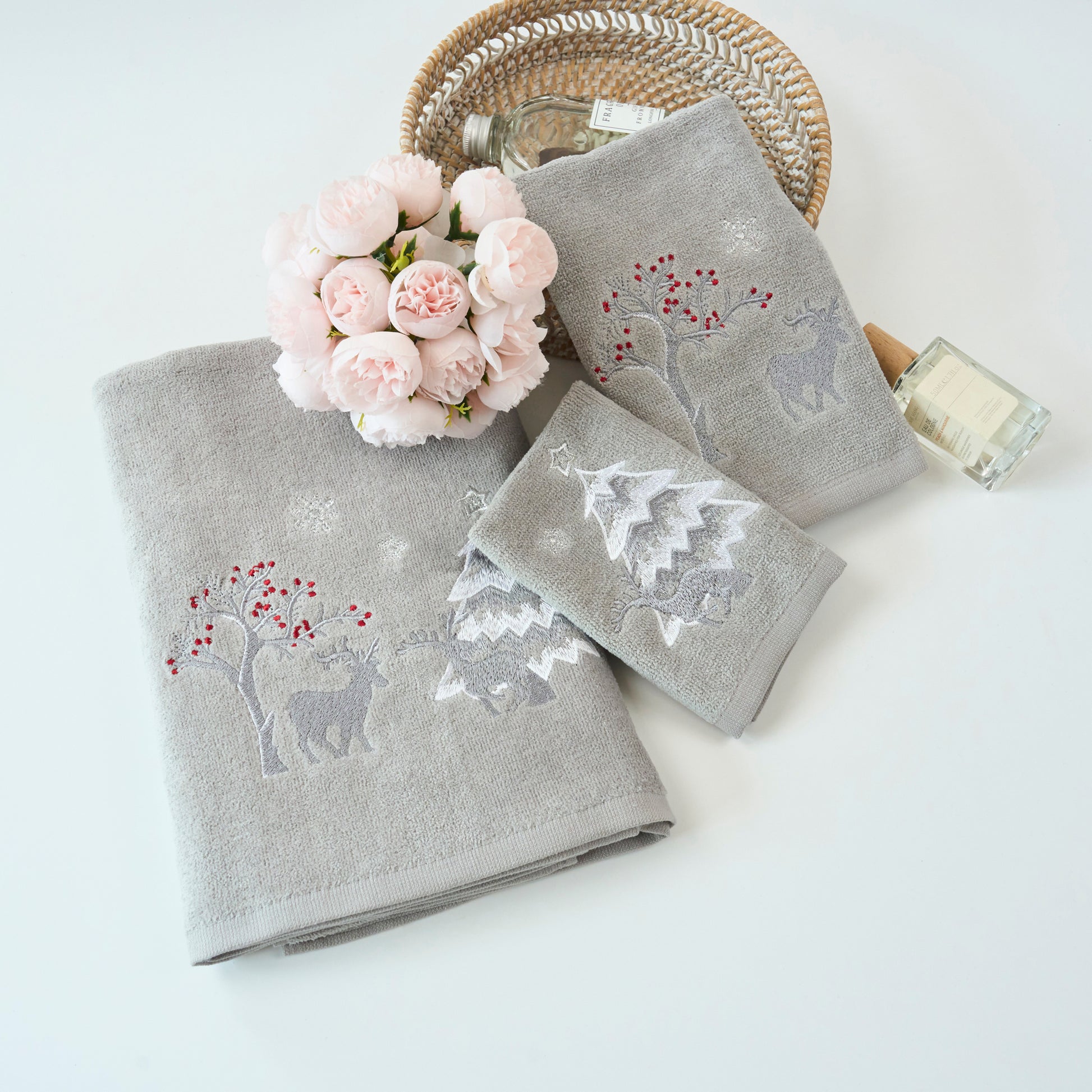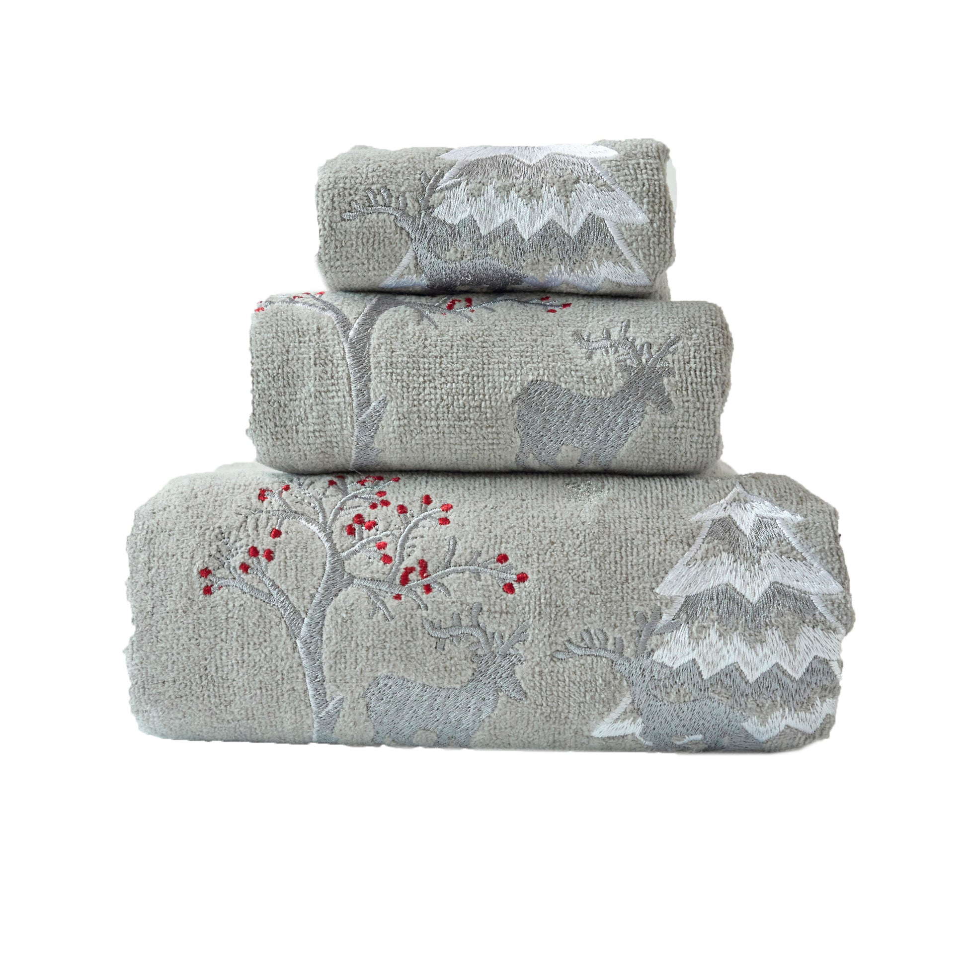 Premium Luxury Xmas Decor Soft 100% Cotton Embroidered Bathroom Christmas 3 Piece Towel Set, Silver Deer