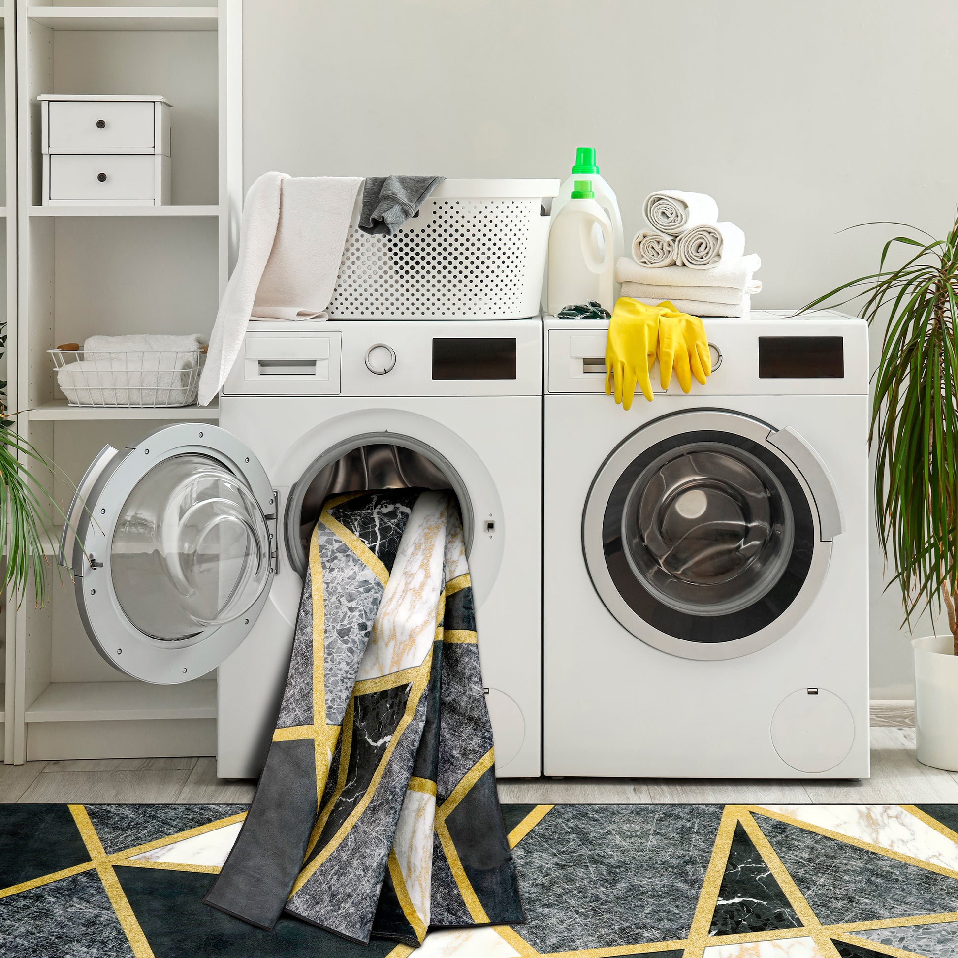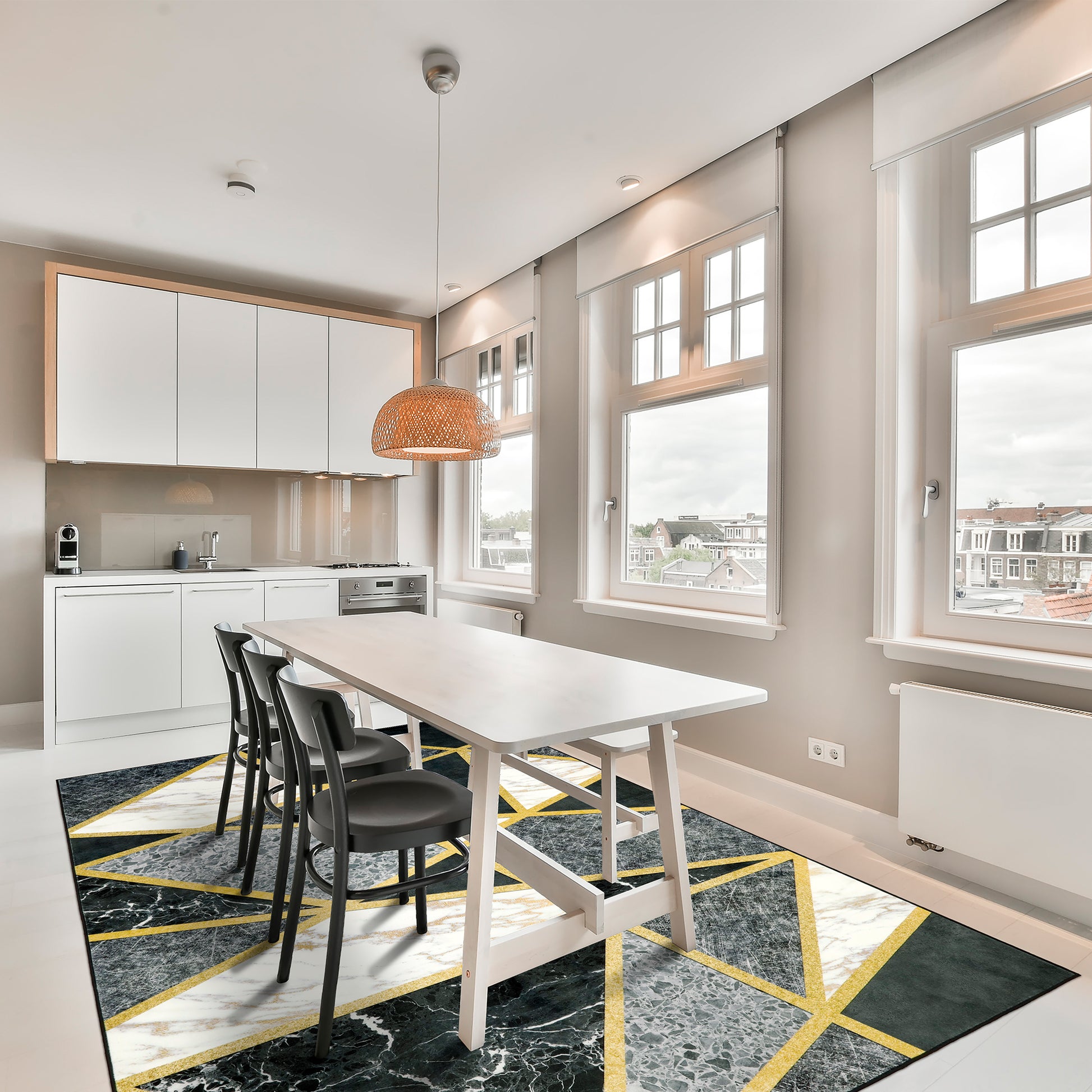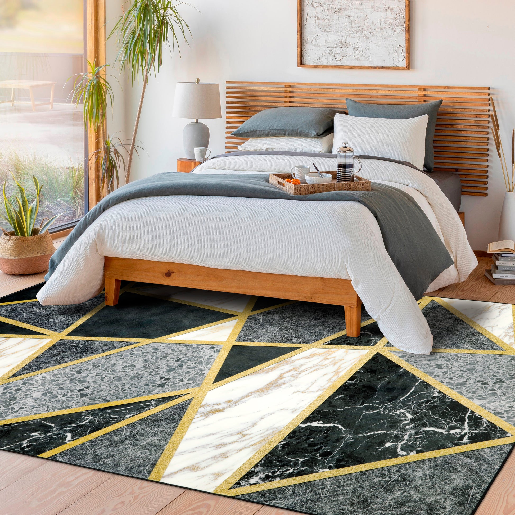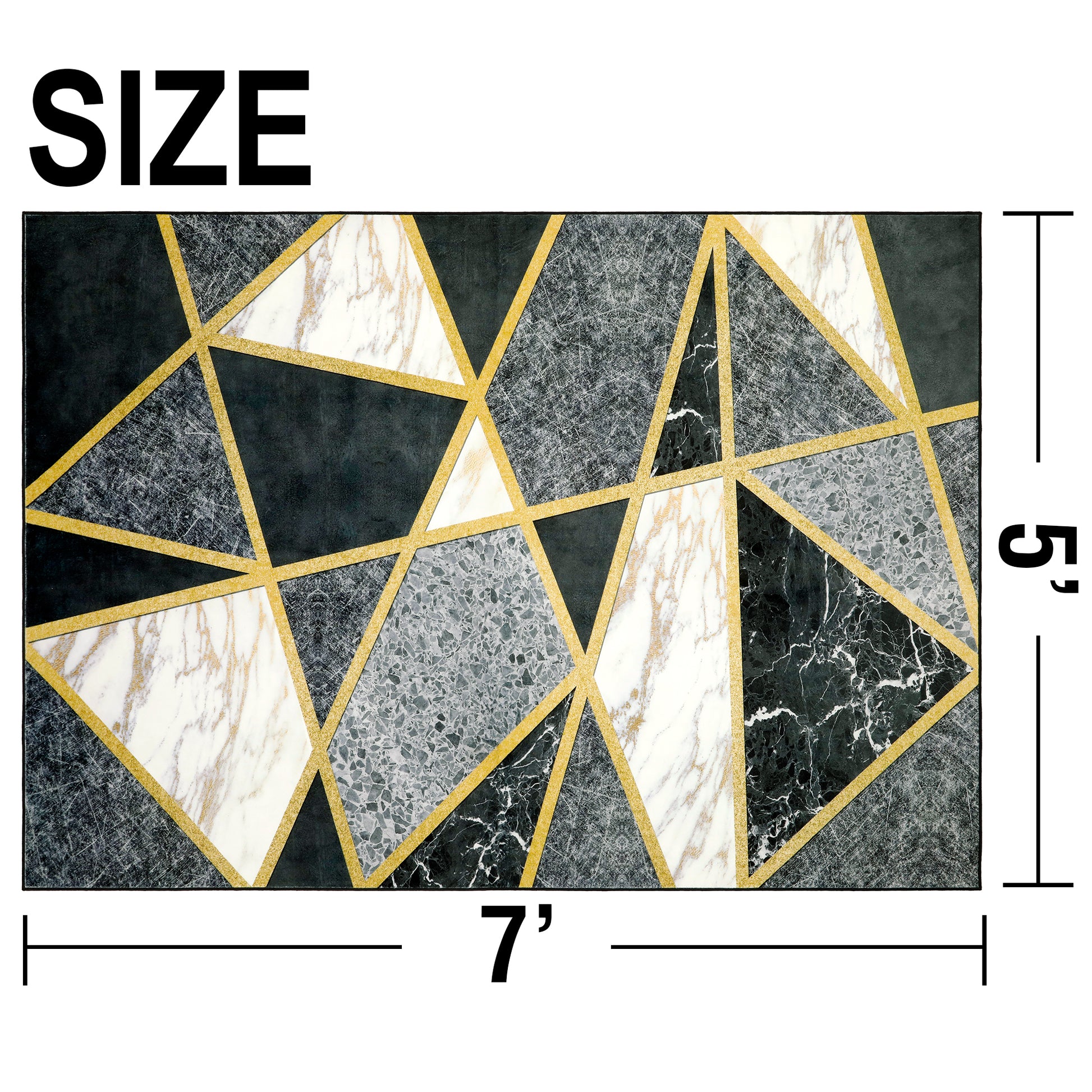 - This Contemporary Geometric Design Made up of Many Irregular Polygonal Shapes Filled with White Marble with Gold Veining, Black Marble with Fine white Veining, Gray Stone with Cracked Textures and Charcoal Textured Surfaces. All Geometric Sections are Separated by Thin Gold Metallic Gilded Edging Lines. Strong Water Absorbent Ability. This Boho Rug is the Perfect Decorative Additive That Protect Your Floors. It Keeps the Room Clean and Tidy
