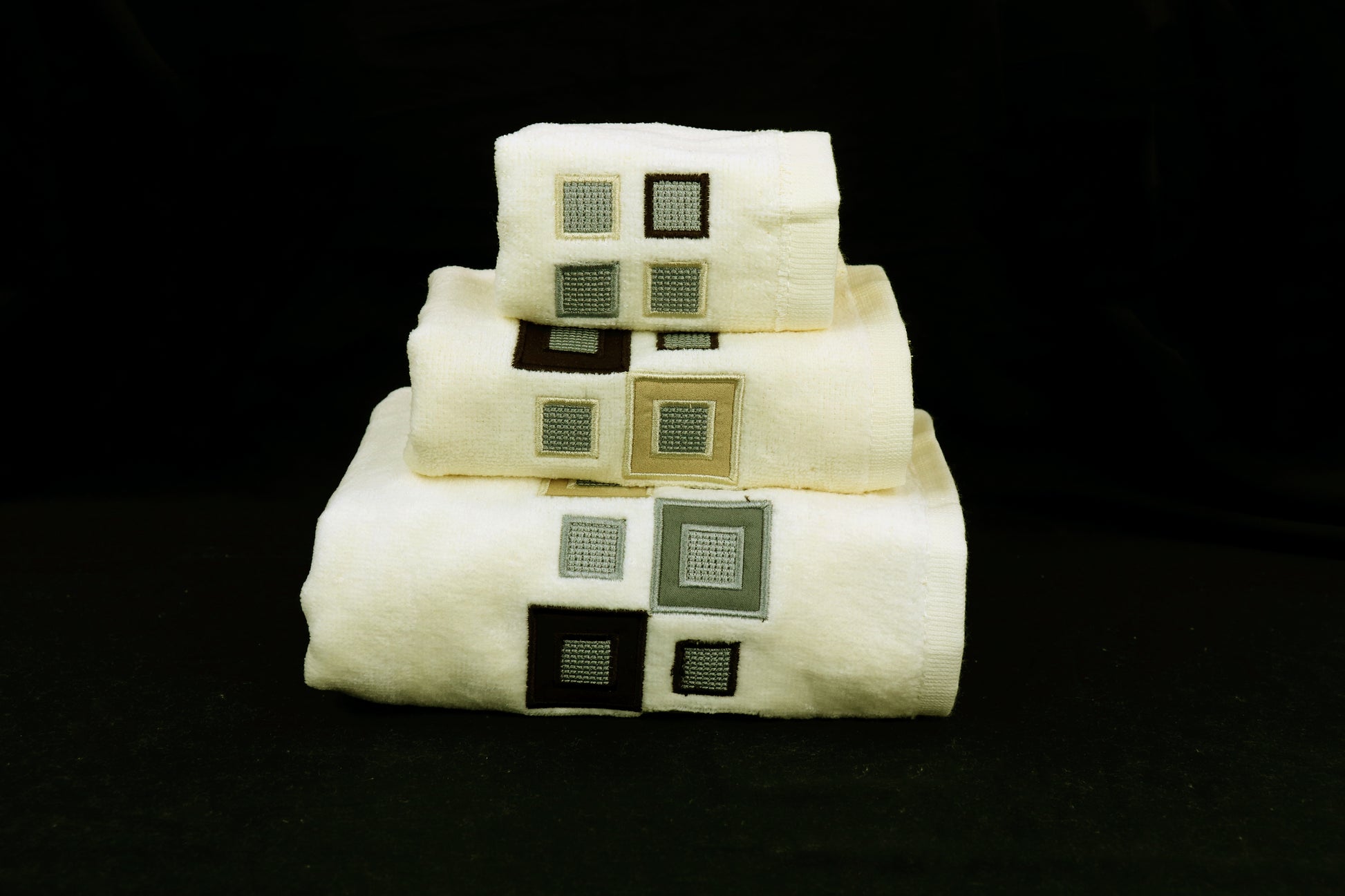 Premium Luxury Decor 100% Cotton Soft Bathroom Modern Embroidered 3 Piece Towel Set, Ivory Squares Pattern