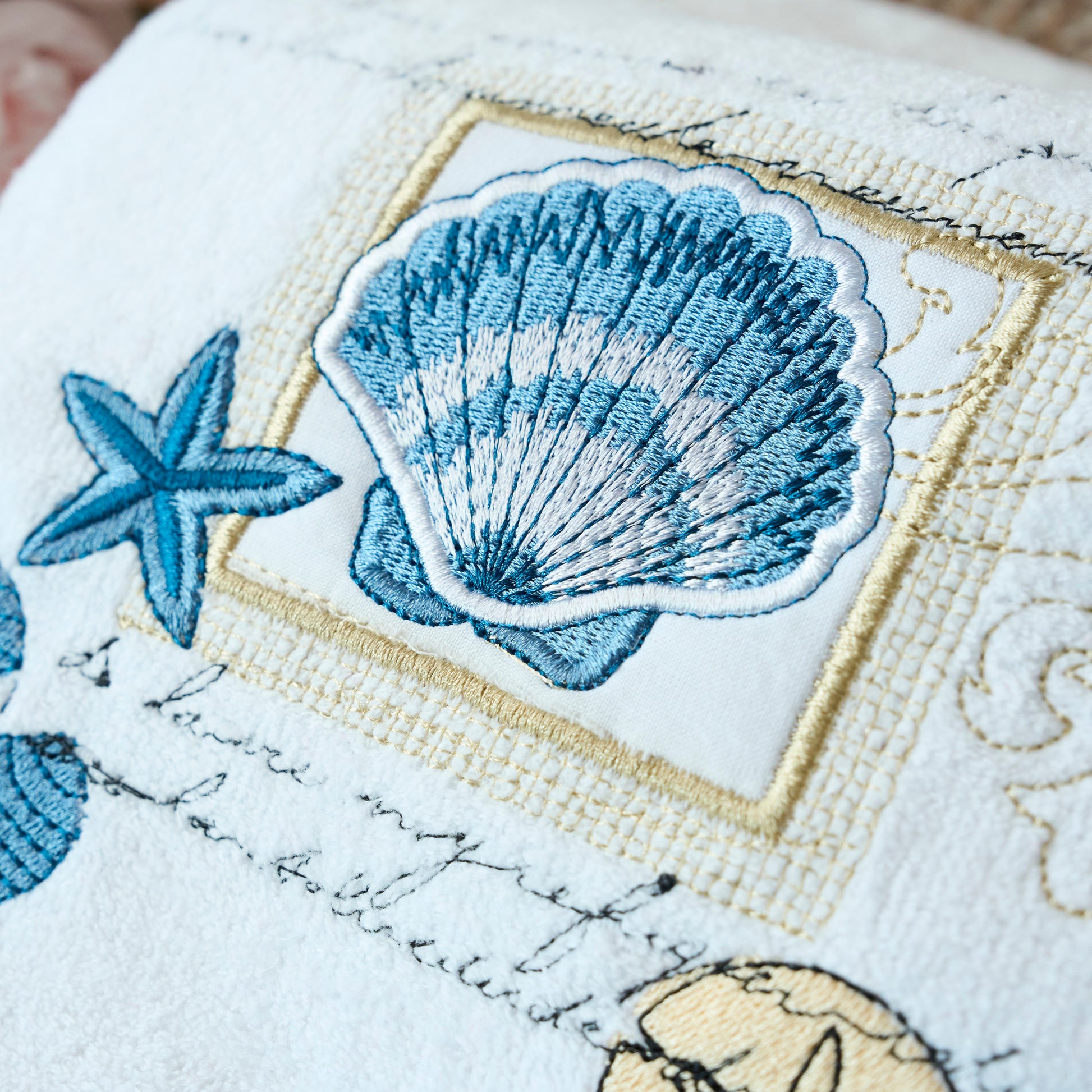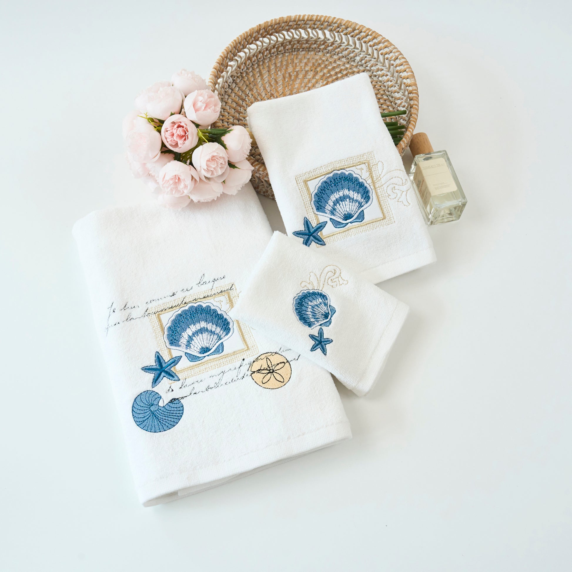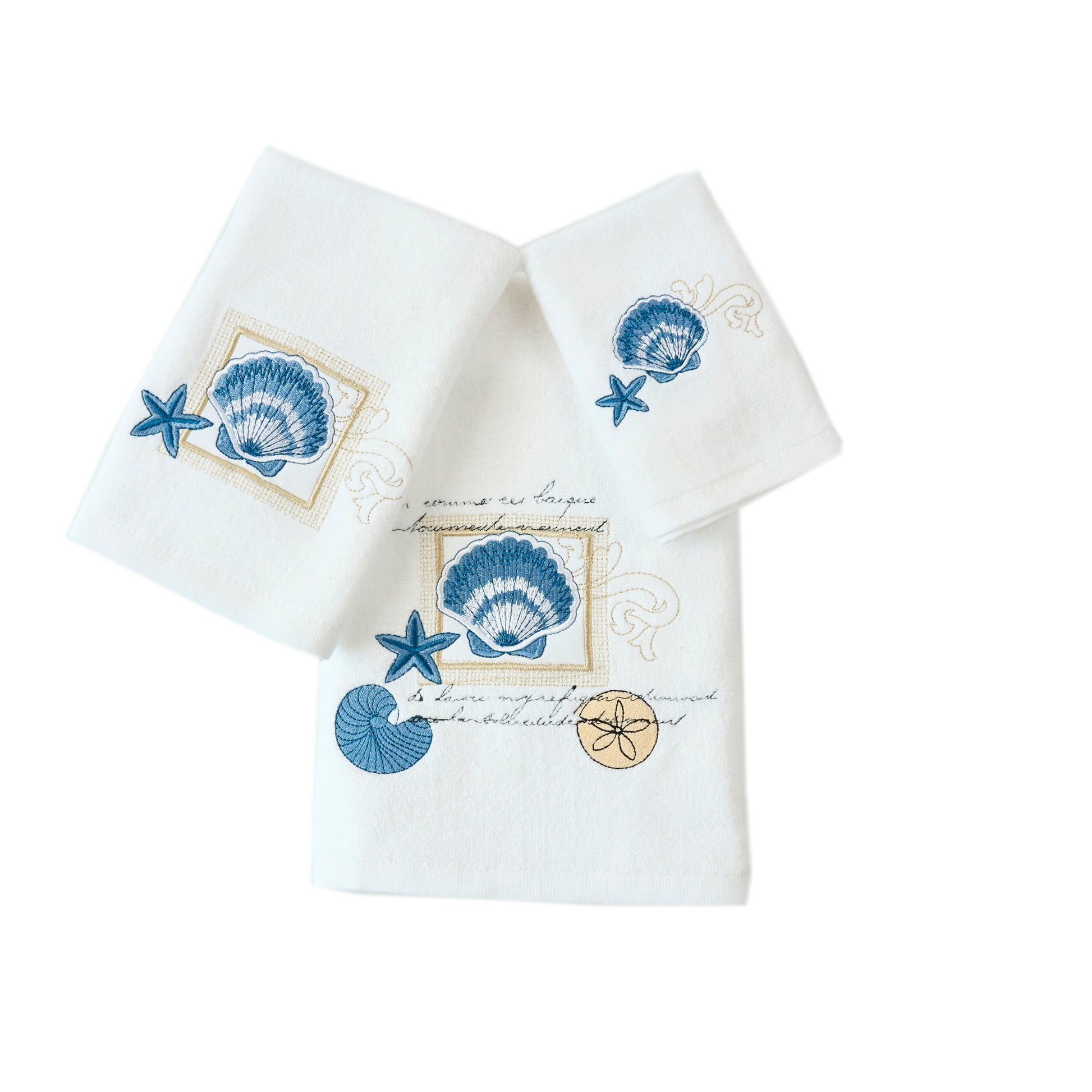 Premium Luxury Decor 100% Cotton Soft Bathroom Modern Embroidered 3 Piece Towel Set, Seashell and Starfish Pattern