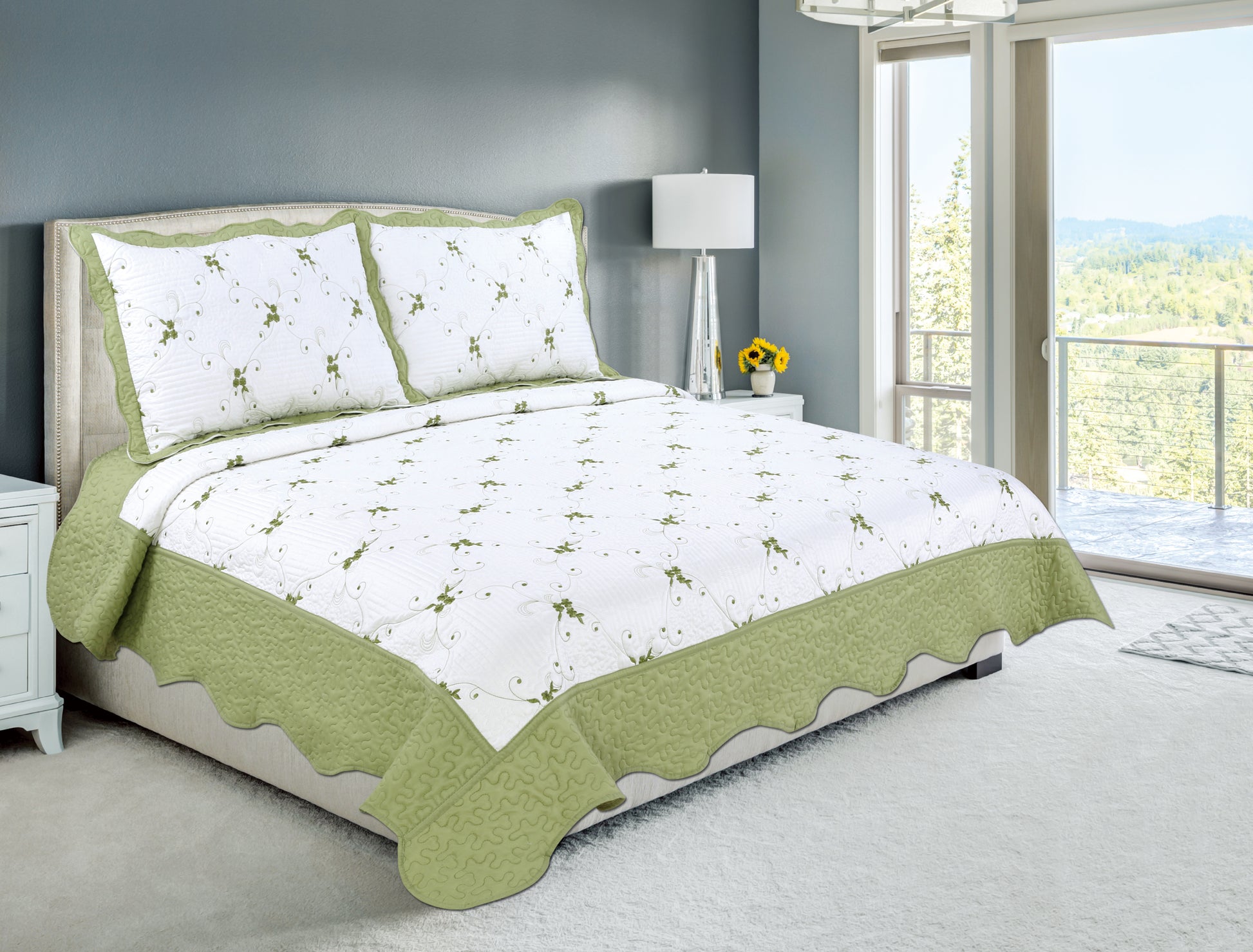 Embroidered Stitching Soft Bedding Solid Summer Quilt Set, Floral Pattern