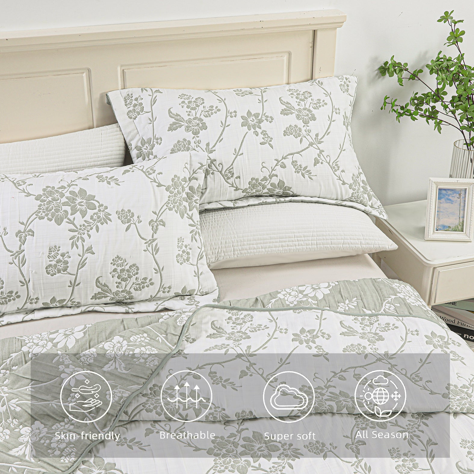 Jacquard Embroidered Stitching Soft Bedding Solid Summer Quilt Set, Green Floral
