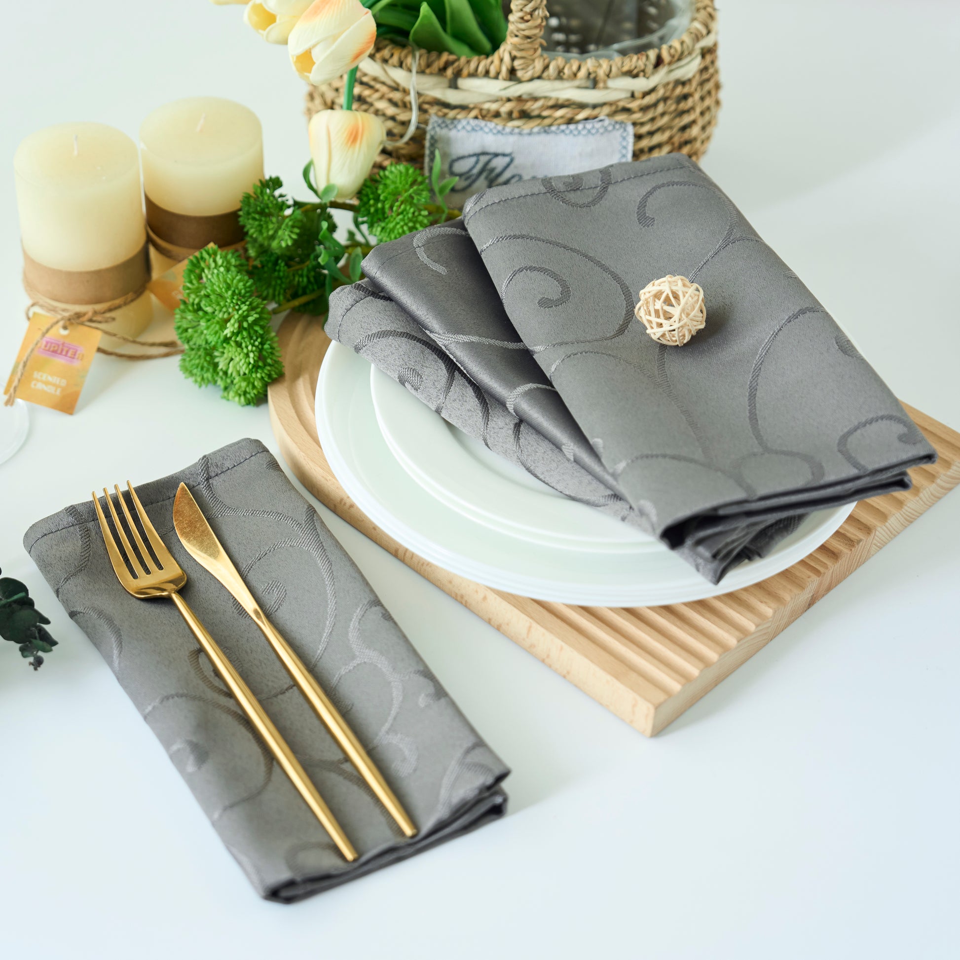 Dimension - 52" x 70" Rectangle for 4 Chairs Table, 60" x 84" Rectangle for 4 to 6 Chairs Table, 60" x 102" Rectangle for 6 to 8 Chairs Table, 60" x 120" Rectangle for 8 to 10 Chairs Table, 60" x 144" Rectangle for 10 to 12 Chairs Table, 60" Round for 4 Chairs Table, 70" Round for 4 to 6 Chairs Table, 90" Round for any 6 to 8 Chairs Table, 70" x 70" Square for 4 to 6 Chairs Table, Napkins Set is 4 Pieces Square 18" x 18"