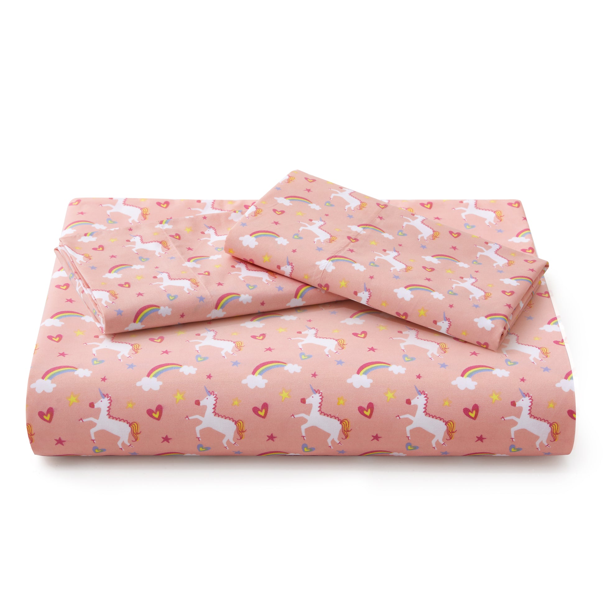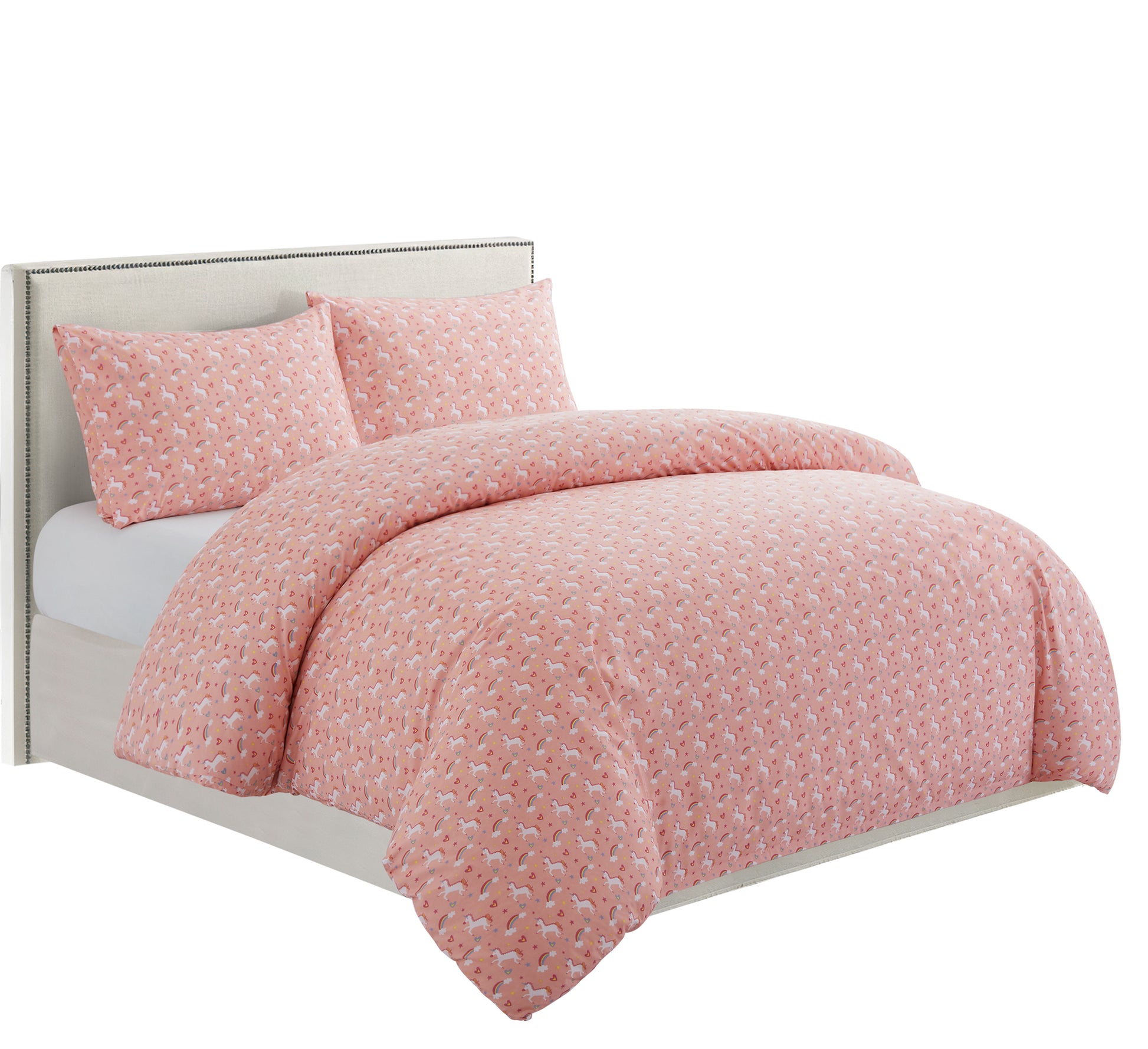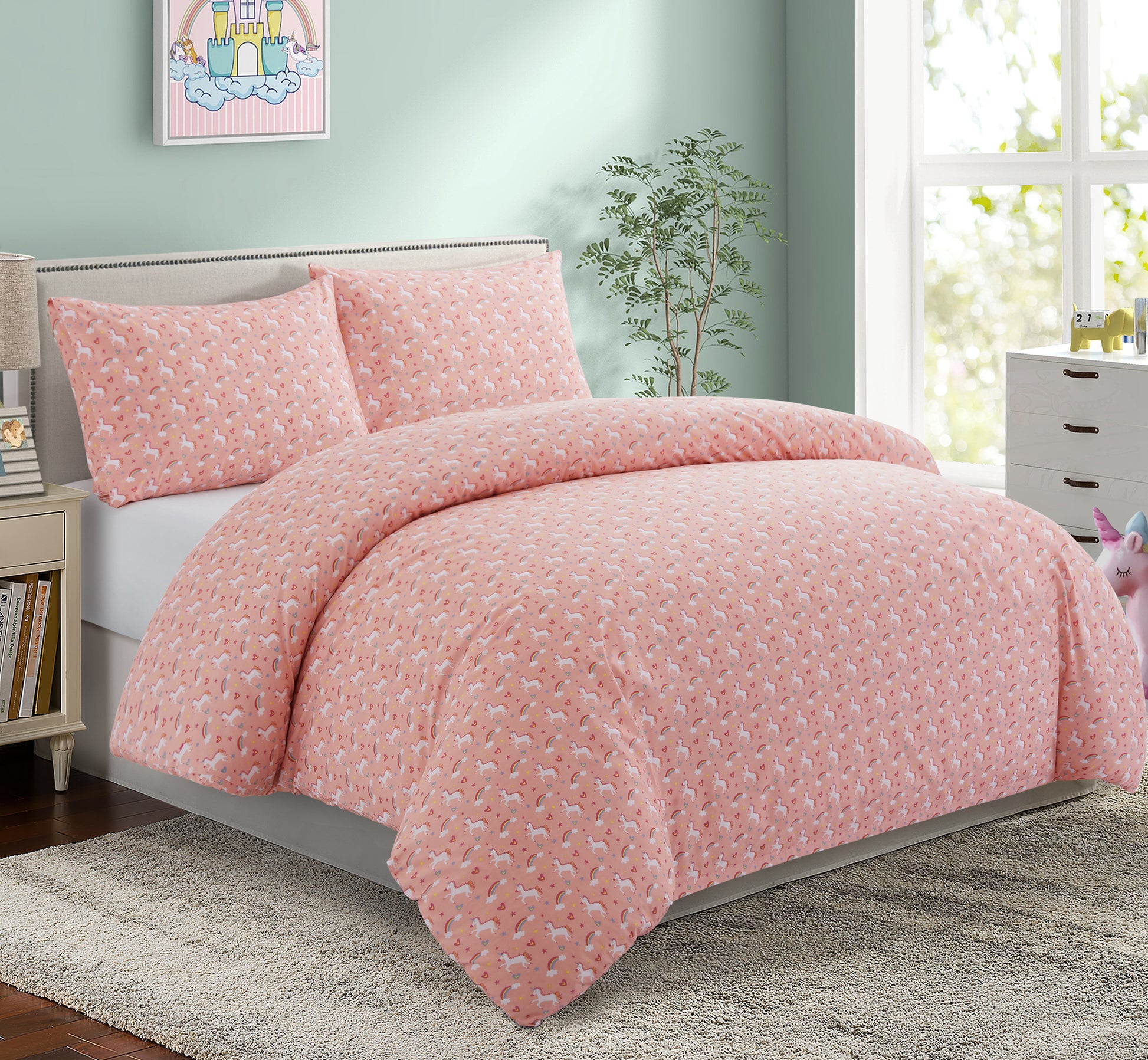 Kids Girls Printed 600 Thread Count Soft Cotton Percale Duvet Cover Set with Corner Tie and Zipper, Pink Unicorn Rainbow