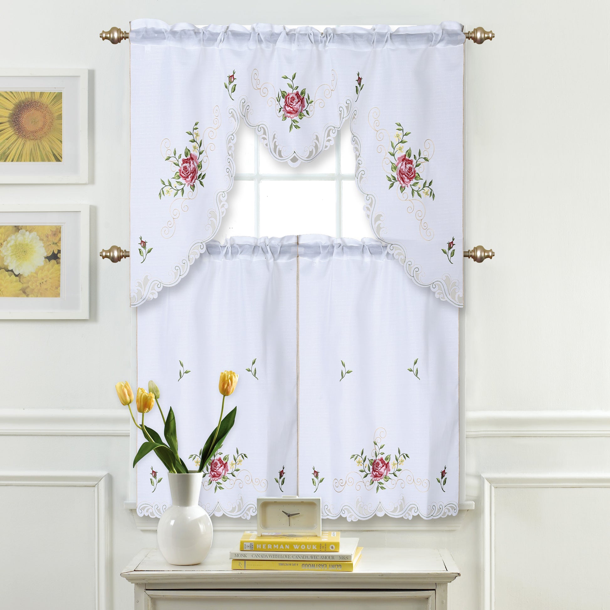 Home Décor Drapery Light Filtering Rod Pocket Lace Embroidered Kitchen Window Curtain Swag Valance and Tier Set, Pink Red Rose Floral