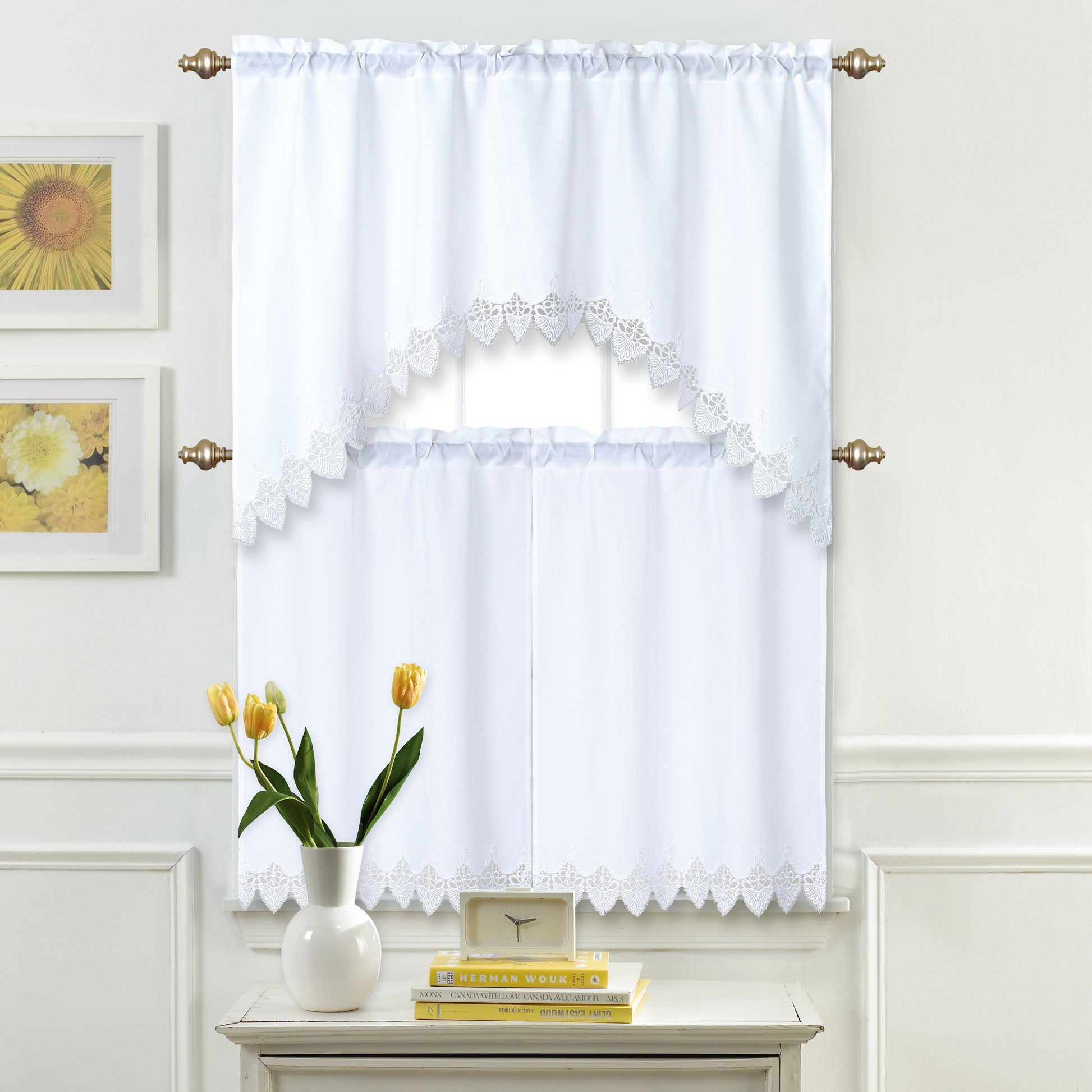 Home Décor Drapery Light Filtering Rod Pocket Lace Embroidered Kitchen Window Curtain Swag Valance and Tier Set, Floral