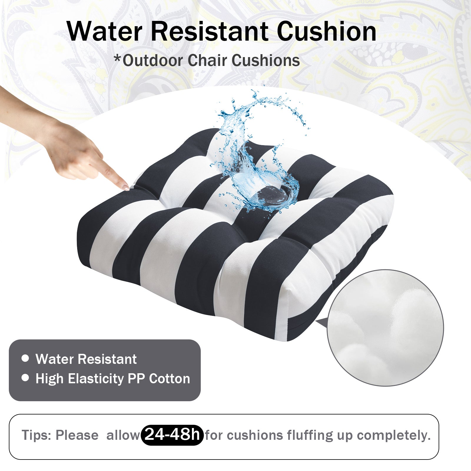Feature - UV Rays Resistant, Water Resistant, Fade Resistant, Resistant of Mildew, Mold, Stains, Moisture and Weather. Sewn seam closure with Sewn Circle Tack Construction Prevents Cushion Fill from Shifting and Bunching. The Tie-Less Design Make Your Cushion and Chair Match, You Will Not See Those Ugly Ties. Now You Can Enjoy Your Hot Summer Sunshine, Family Time or BBQ with Your Family in Your Patio Backyard Garden or Deck. To extend Cushion Life, Store It Indoors or Cover It When Not in Use