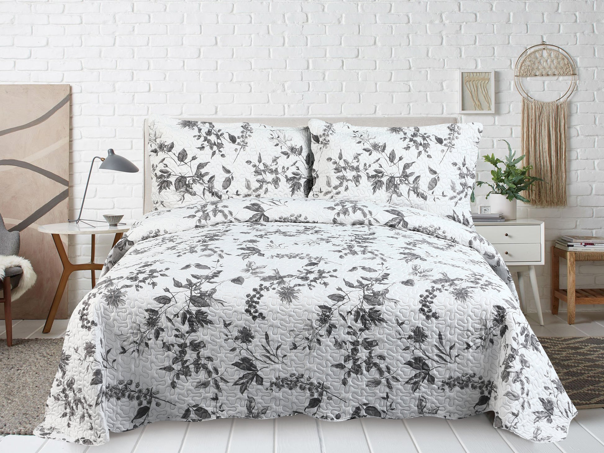 Printed Modern Design - This Unique Decorative Printed Embossed Quilt Sets is Perfect for Home Decoration. This Pattern is Consist of Grey Chrysanthemum Flower Leaves and Branches with White Base Color. Fine Linen Breathable Elegant and Reversible Luxury Lightweight Quilt Bedding Set. Perfect Choice for Homeowners with Sophisticated Tastes in Decoration