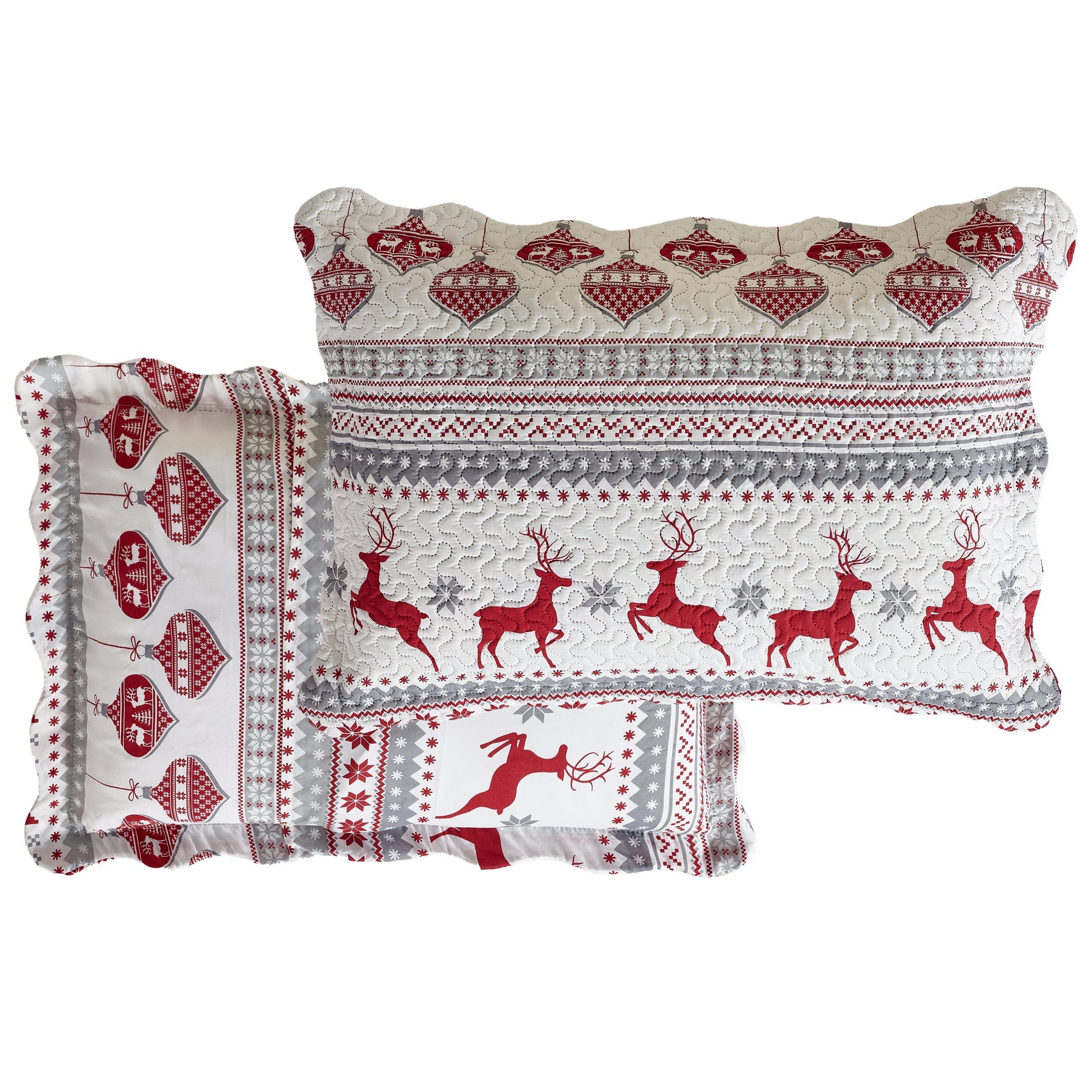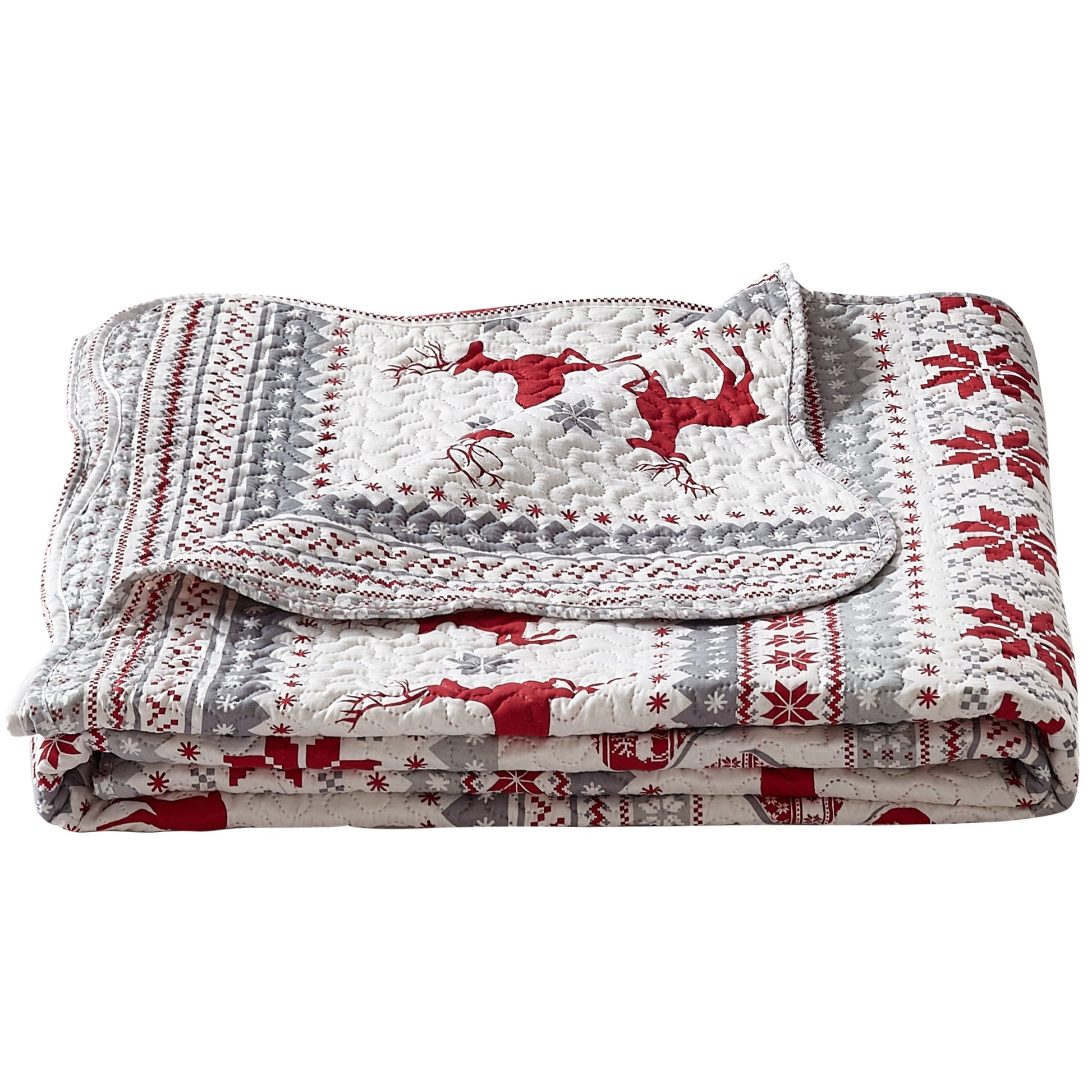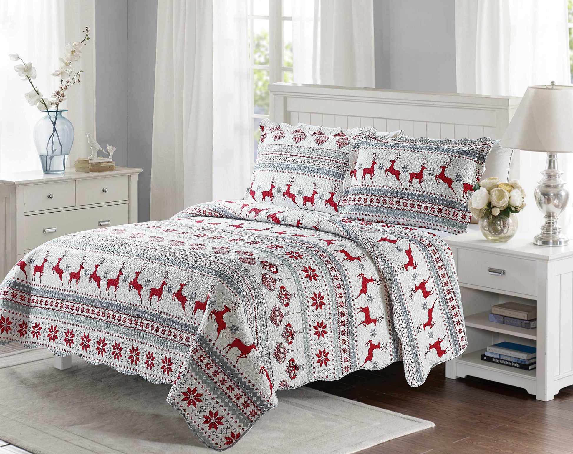 Printed Modern Design - This Unique Decorative Printed Embossed Quilt Sets is Perfect for Home Decoration. This Pattern is Consist of Christmas Red Reindeer Snowflake and Tree Ornaments Pattern with White Grey Silver Color. Fine Linen Breathable Elegant and Reversible Luxury Lightweight Quilt Bedding Set. Perfect Choice for Homeowners with Sophisticated Tastes in Decoration
