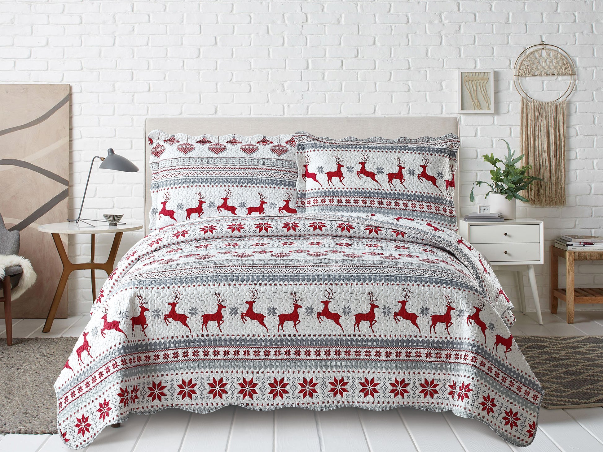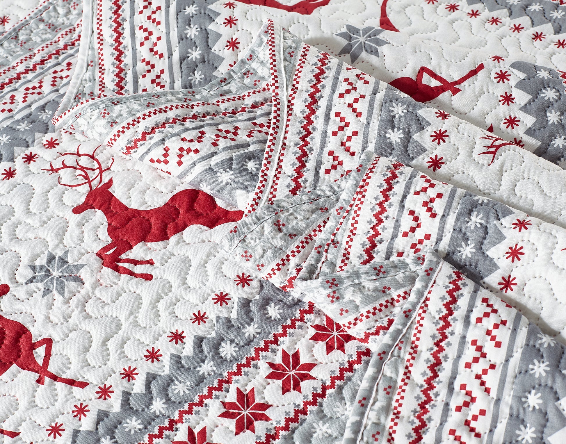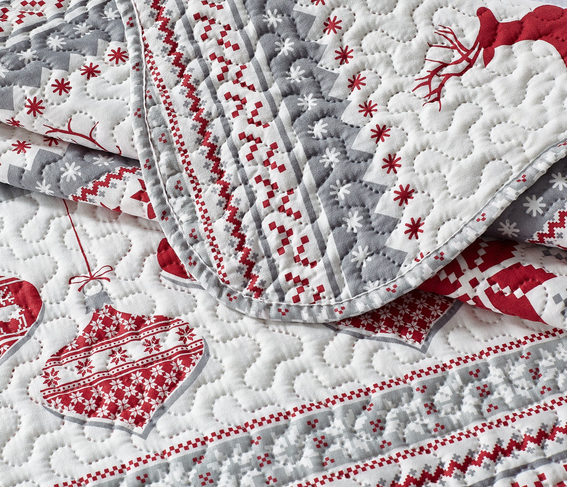 Printed Modern Design - This Unique Decorative Printed Embossed Quilt Sets is Perfect for Home Decoration. This Pattern is Consist of Christmas Red Reindeer Snowflake and Tree Ornaments Pattern with White Grey Silver Color. Fine Linen Breathable Elegant and Reversible Luxury Lightweight Quilt Bedding Set. Perfect Choice for Homeowners with Sophisticated Tastes in Decoration