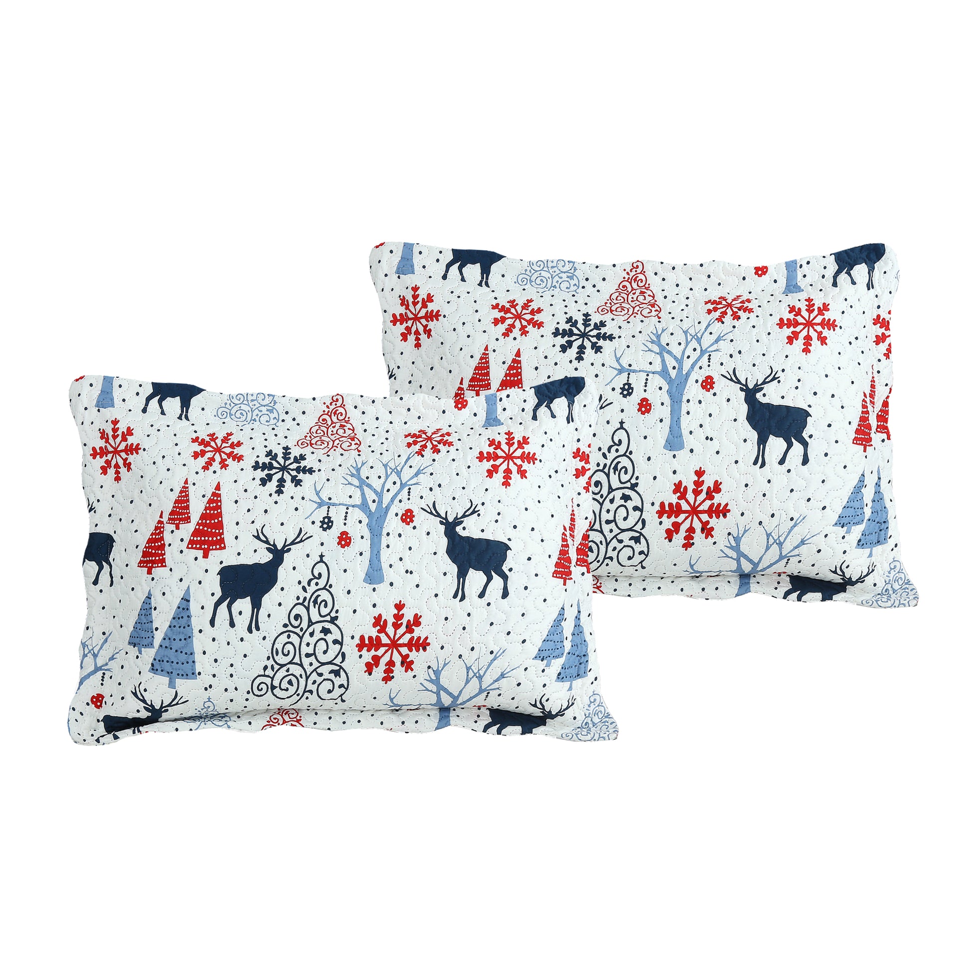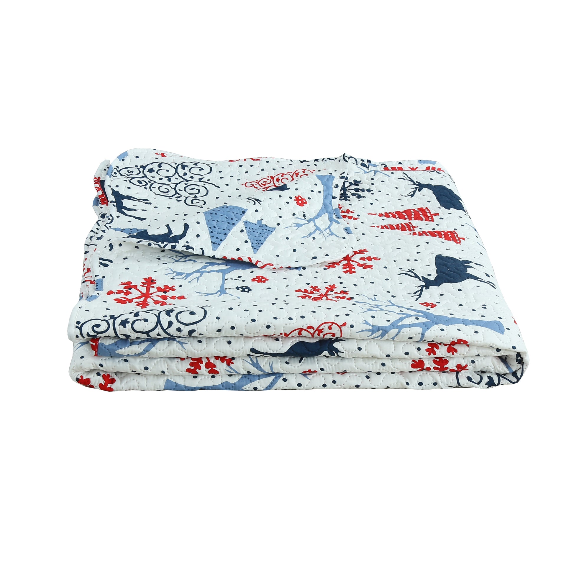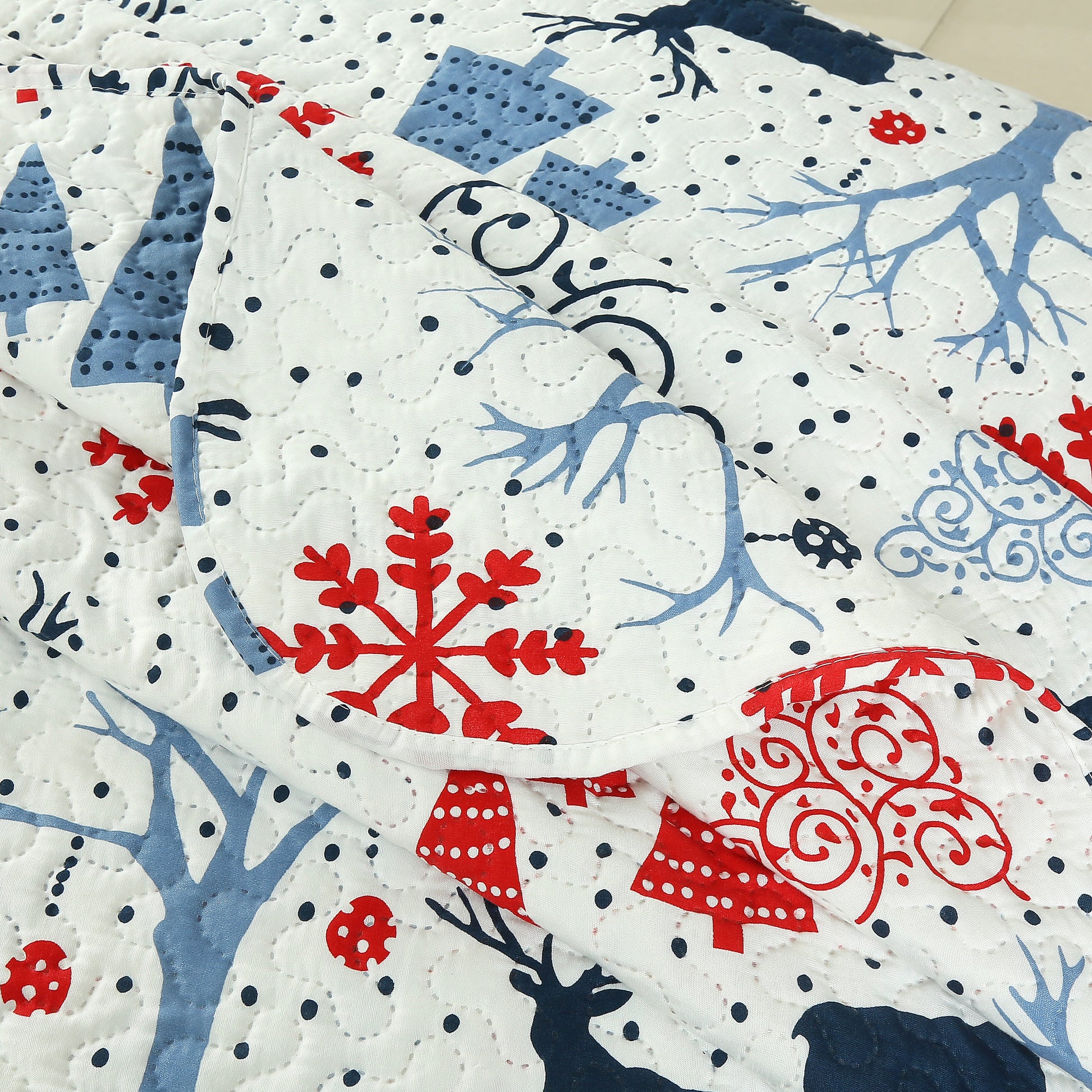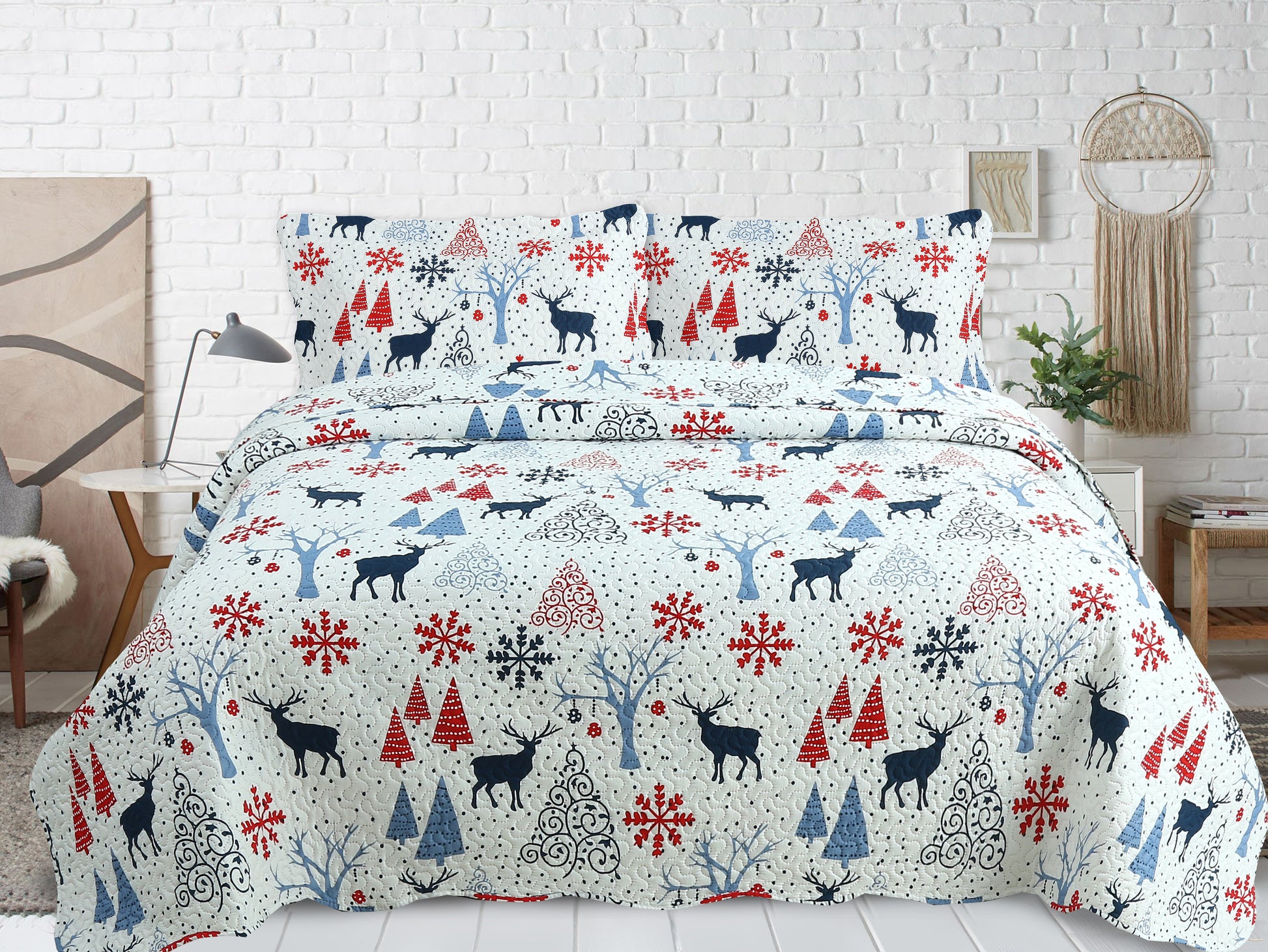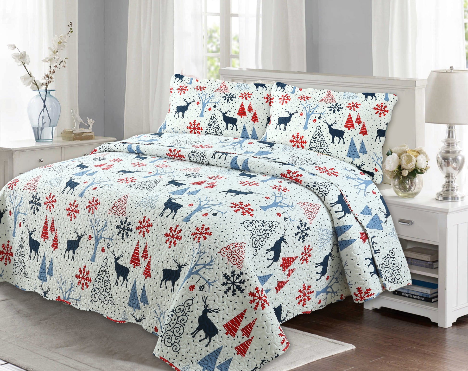 Printed Modern Design - This Unique Decorative Printed Embossed Quilt Sets is Perfect for Home Decoration. This Modern Christmas Pattern is Consist of Xmas Reindeer Snowflake Christmas Tree Deer Ornaments Pattern Blue Red Navy Color with White Base. Fine Linen Breathable Elegant and Reversible Luxury Lightweight Quilt Bedding Set. Perfect Choice for Homeowners with Sophisticated Tastes in Decoration