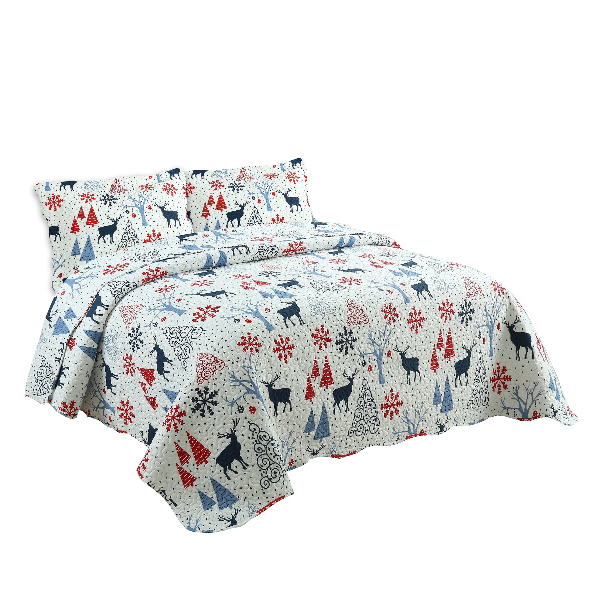 Printed Embossed Pinsonic Soft Bedding Summer Christmas Quilt Set, Xmas Reindeer