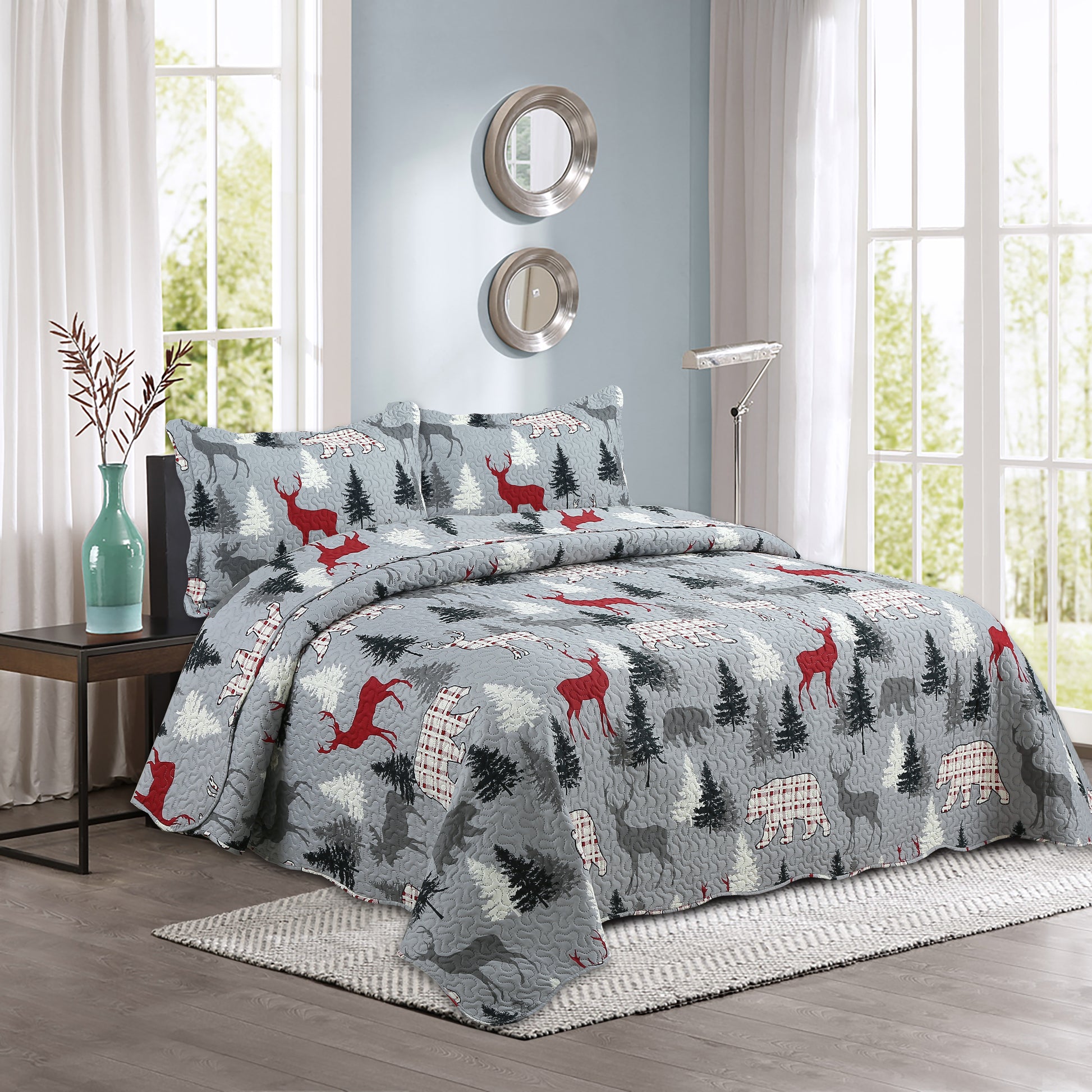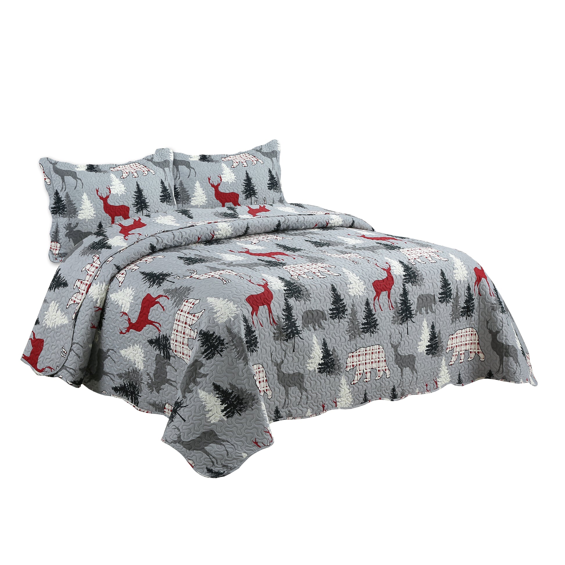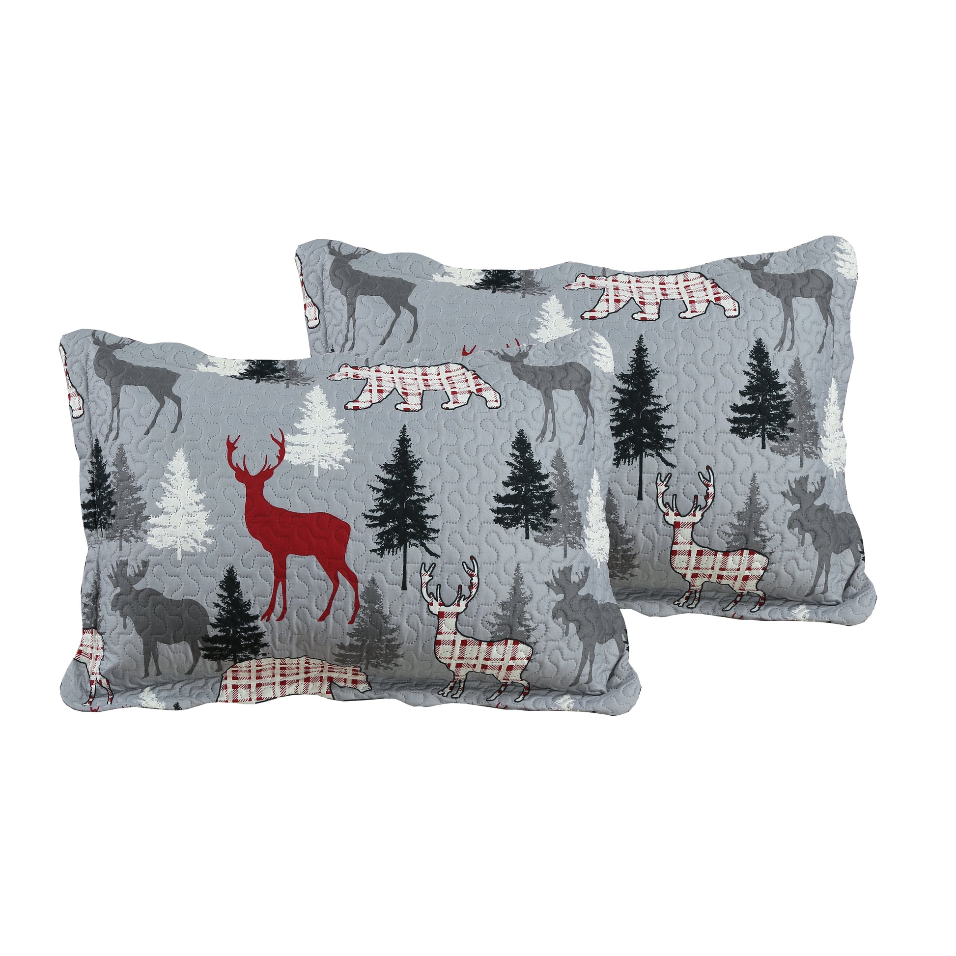 Printed Modern Design - This Unique Decorative Printed Embossed Quilt Sets is Perfect for Home Decoration. This Modern Cottage Rustic Native Pattern is Consist of Grey Moose Red Plaid Bear Reindeer Christmas Tree Pattern with Light Grey Base. Fine Linen Breathable Elegant and Reversible Luxury Lightweight Quilt Bedding Set. Perfect Choice for Homeowners with Sophisticated Tastes in Decoration