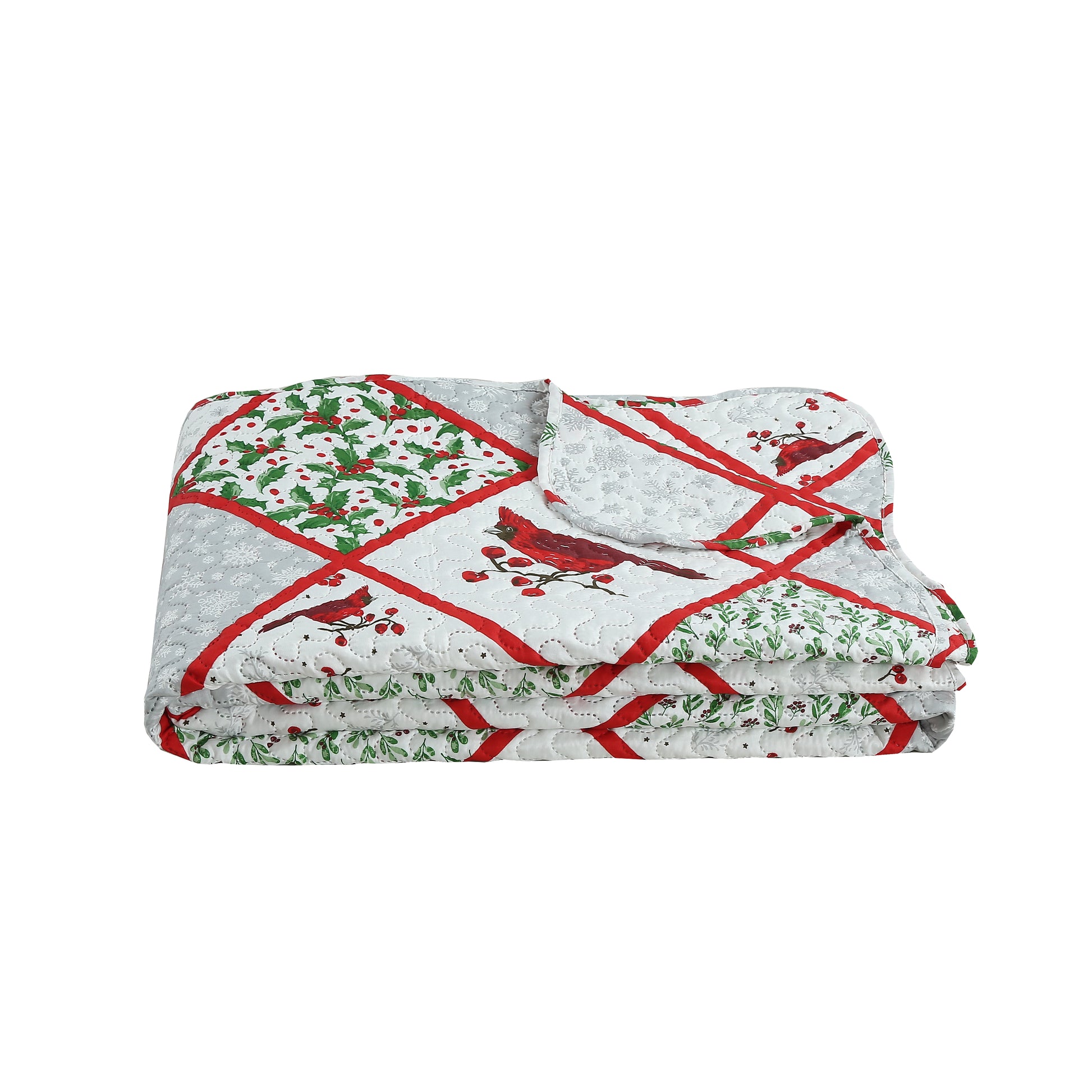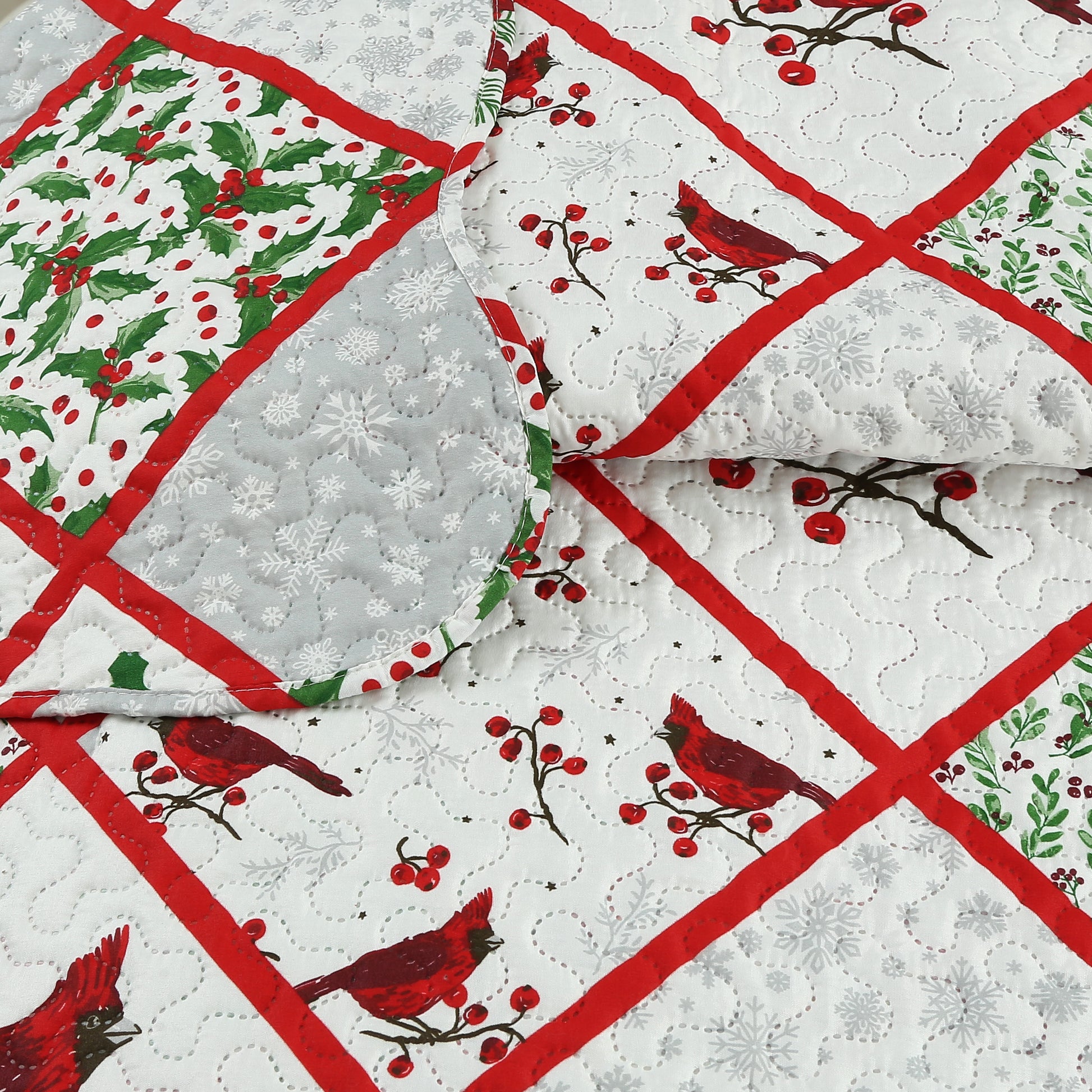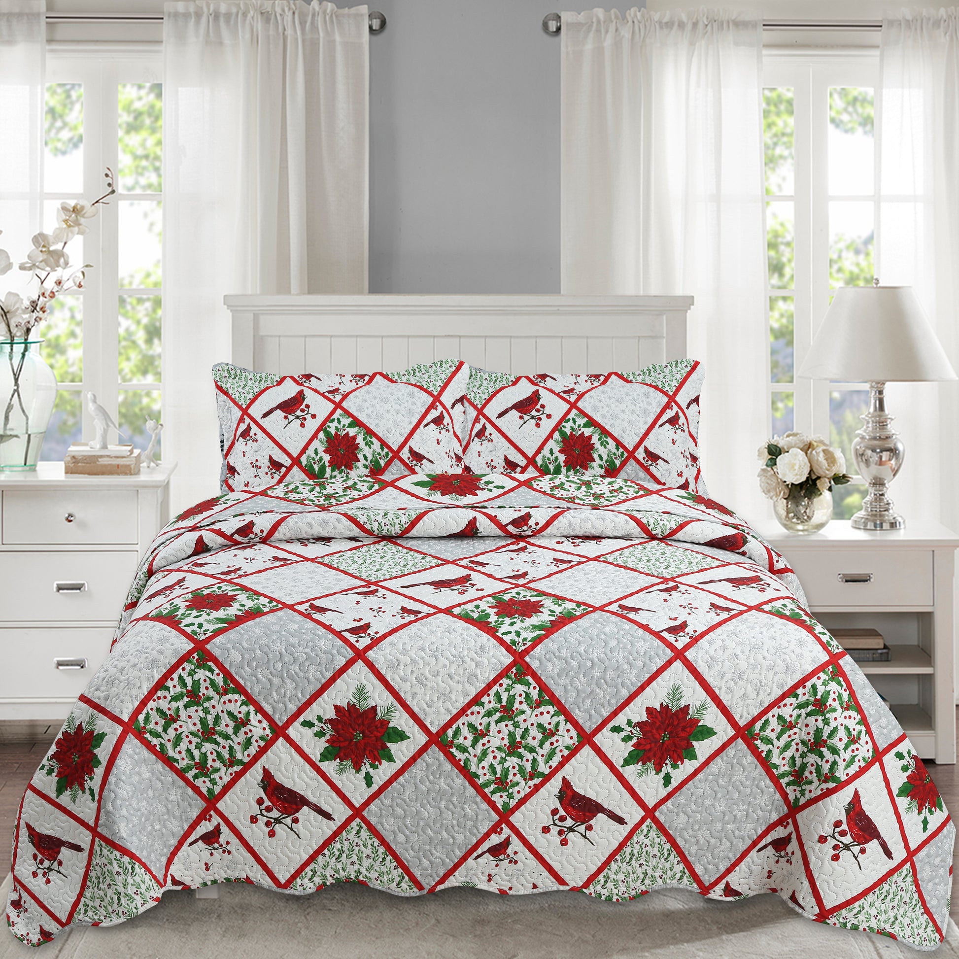 Printed Modern Design - This Unique Decorative Printed Embossed Quilt Sets is Perfect for Home Decoration. This Modern Christmas Pattern is Consist of Xmas Red Cardinal Poinsettia Christmas Holy Wreath and Snowflake with Diagonal Plaid White Base. Fine Linen Elegant and Reversible Luxury Lightweight Quilt Bedding Set. Perfect Choice for Homeowners with Sophisticated Tastes in Decoration
