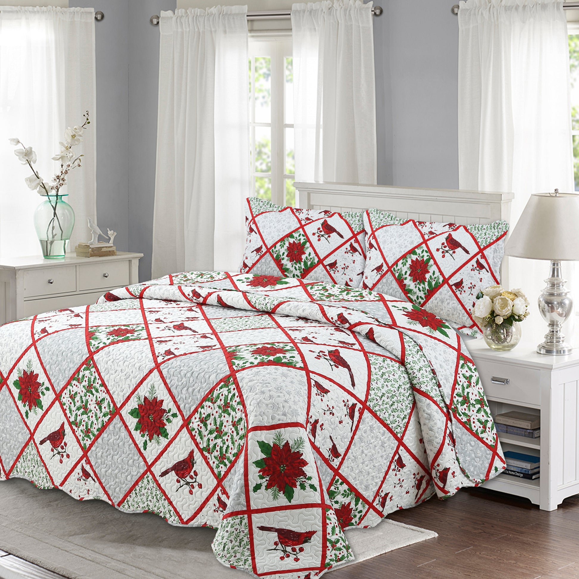 Printed Embossed Pinsonic Soft Bedding Summer Quilt Set, Christmas Red Cardinal Poinsettia