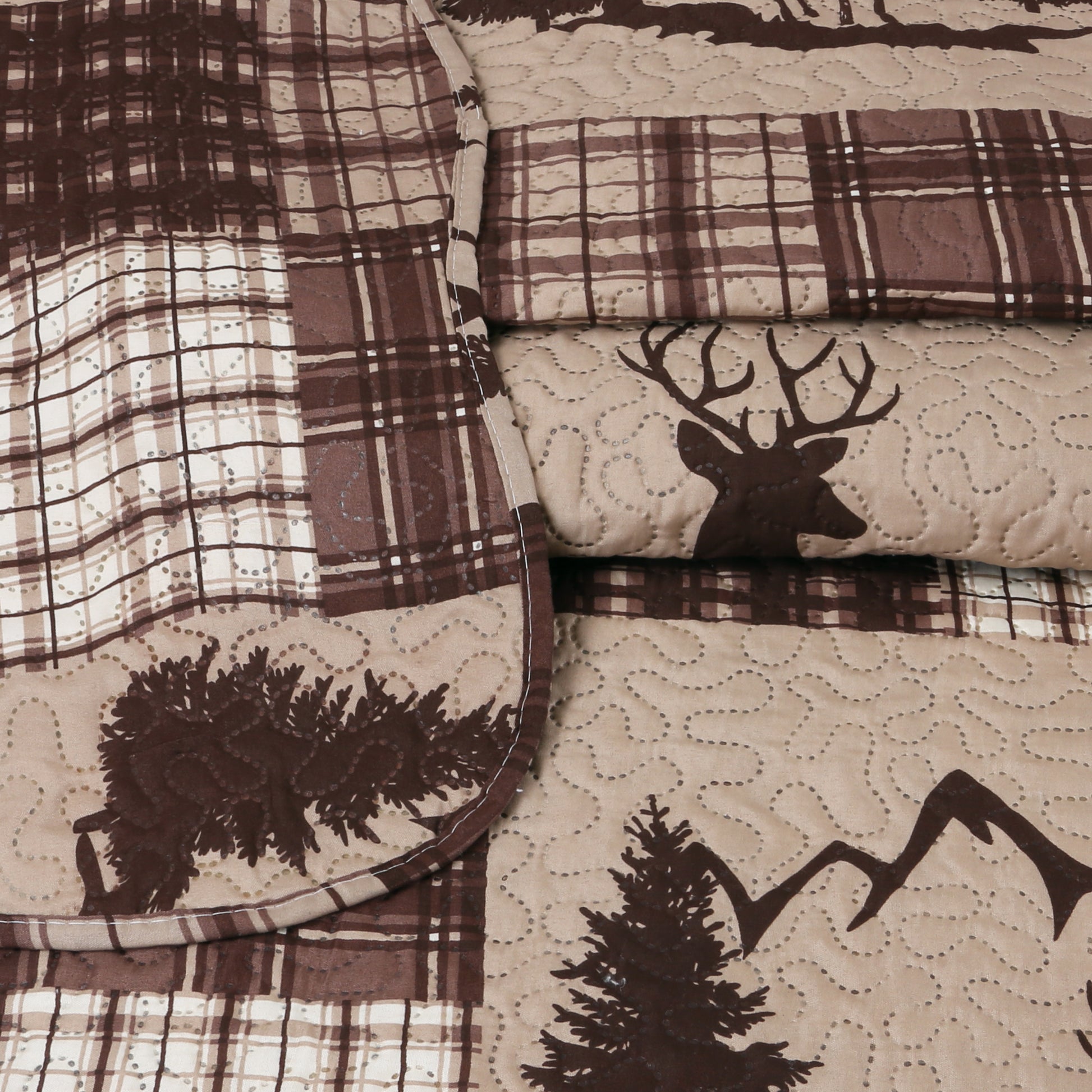 Printed Embossed Pinsonic Soft Bedding Summer Quilt Set, Brown Maple Deer Plaid