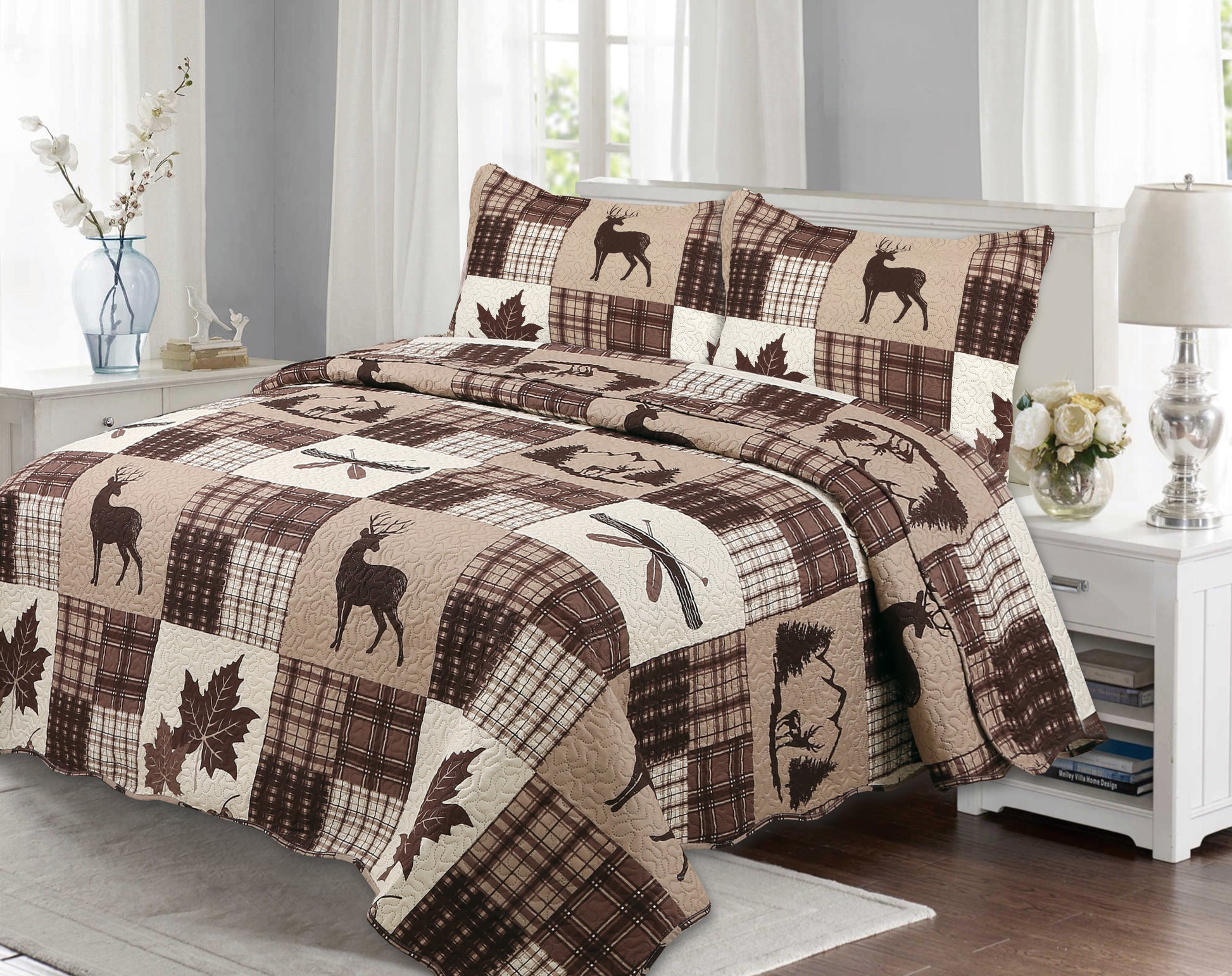 Printed Modern Design - This Unique Decorative Printed Embossed Quilt Sets is Perfect for Home Decoration. This Modern Cabin Plaid Pattern is Consist of Brown Maple Leaves Canoe with Cream Base and Reindeer with Taupe Base. Fine Linen Breathable Elegant and Reversible Luxury Lightweight Quilt Bedding Set. Perfect Choice for Homeowners with Sophisticated Tastes in Decoration