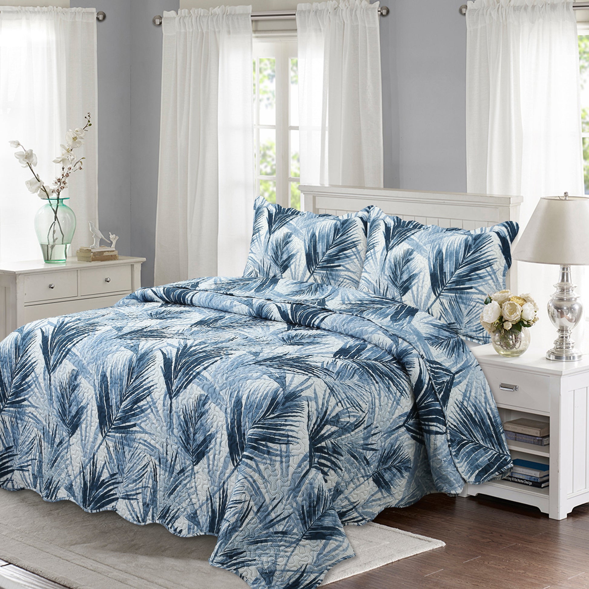 Printed Embossed Pinsonic Soft Bedding Summer Quilt Set, Modern Blue Leaves