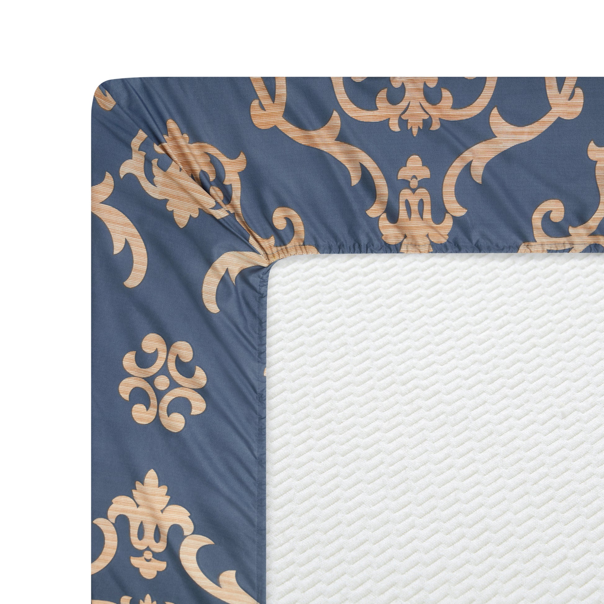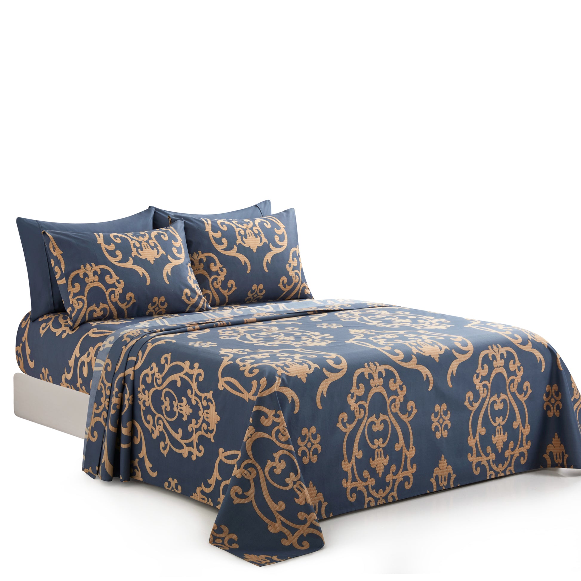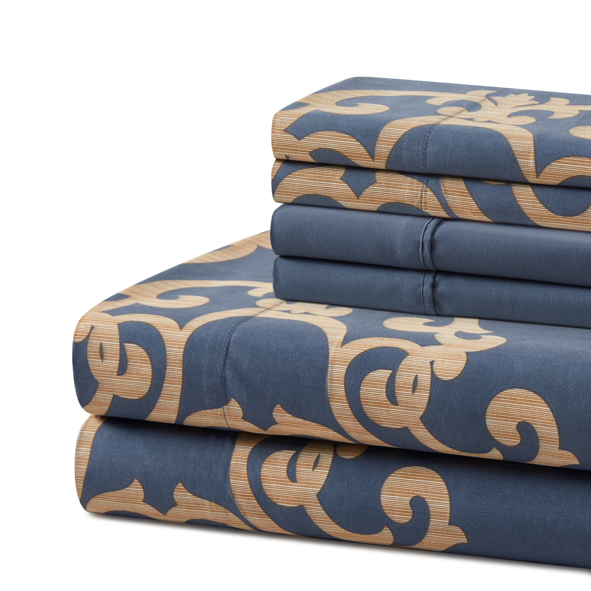 Printed Rayon from Bamboo Soft Deep Pocket Bedding All Season Sheet Set, Gold Damask Navy Blue
