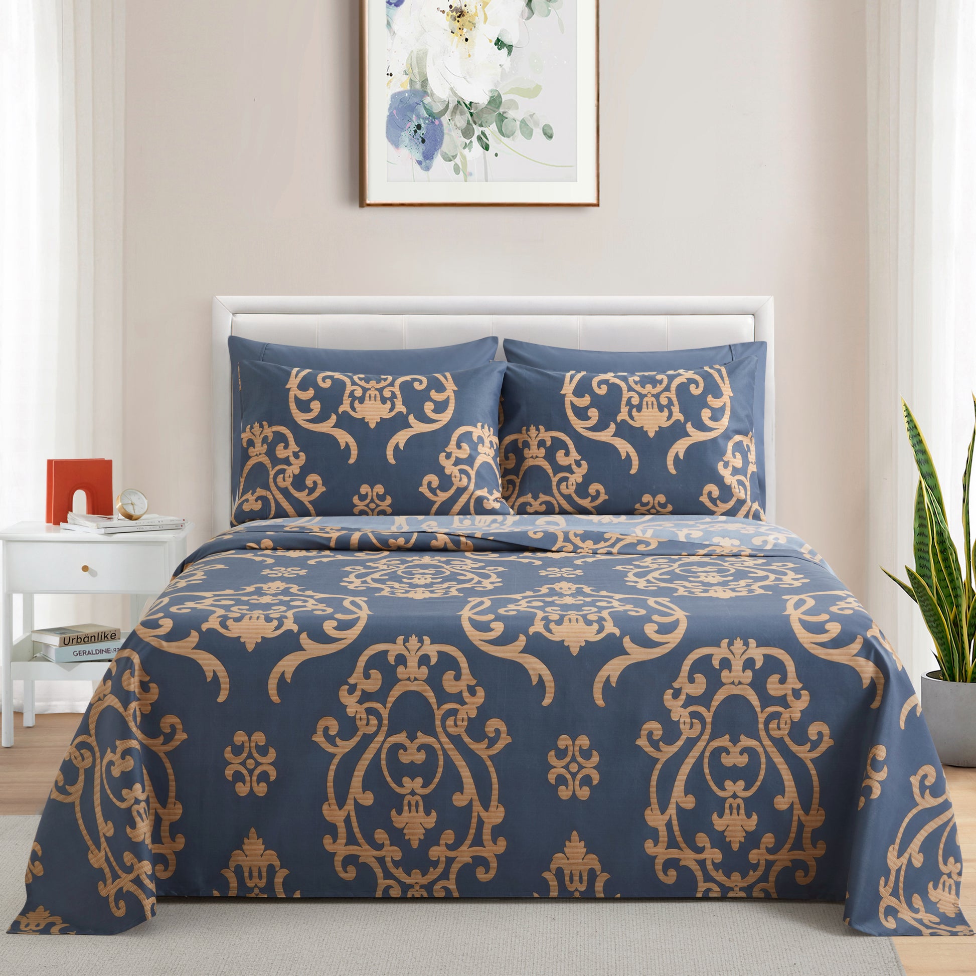 Design - This Classic Elegant Patterns have Navy Blue Base with Gold Floral Damask Decorated on It. Printed Matching Design on the 2 Pillowcases. Our 120 GSM Double Brushed Polyester and Rayon from Bamboo is Soft and Durable and Features a Breathable Weave