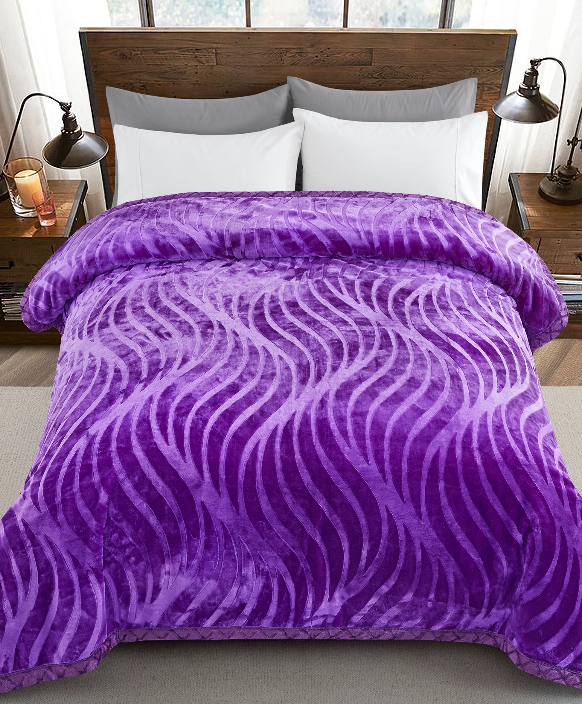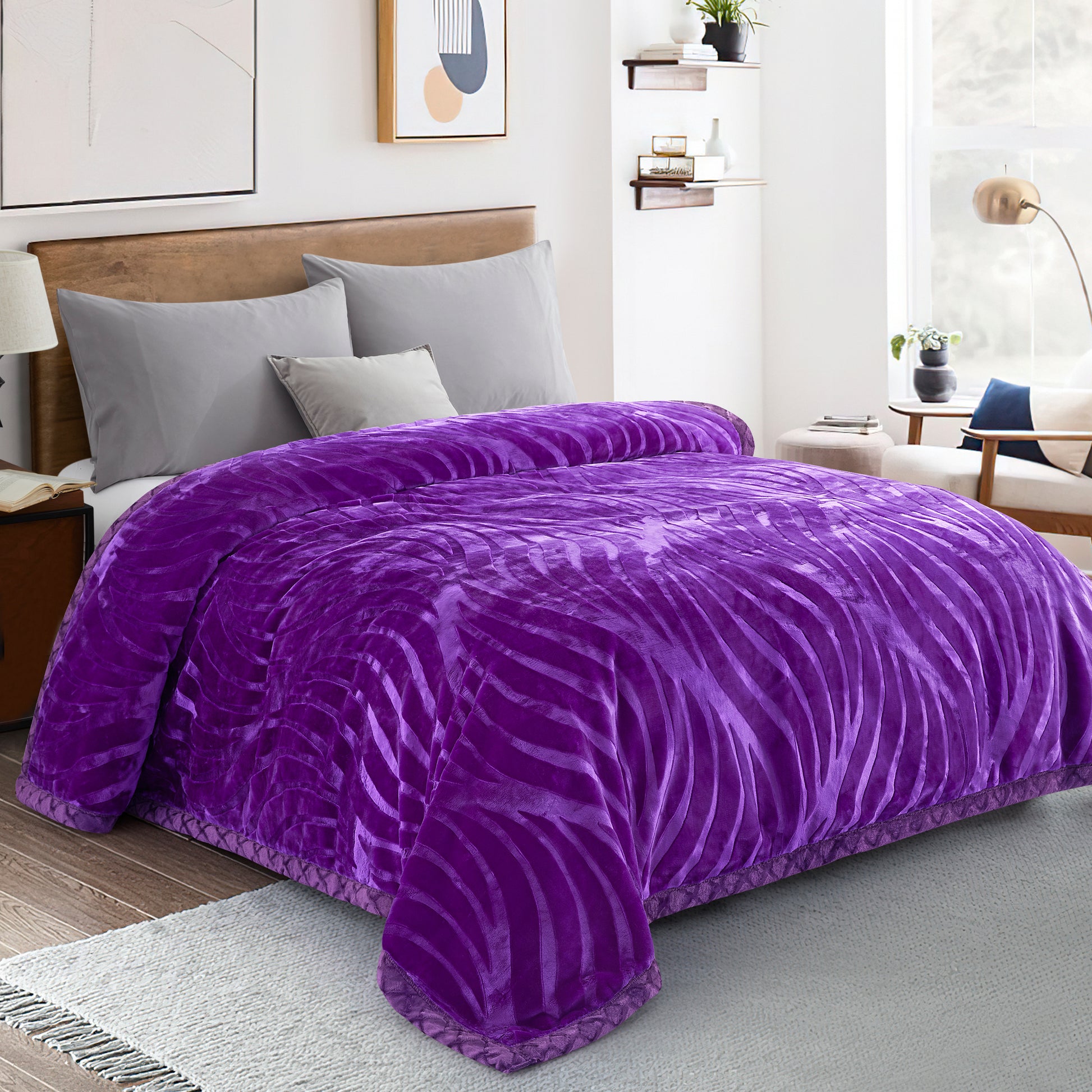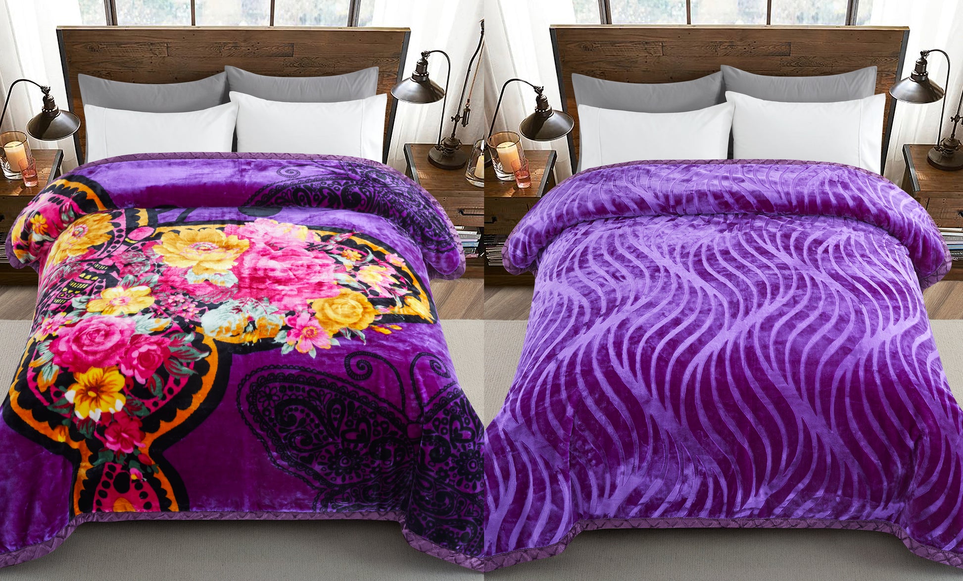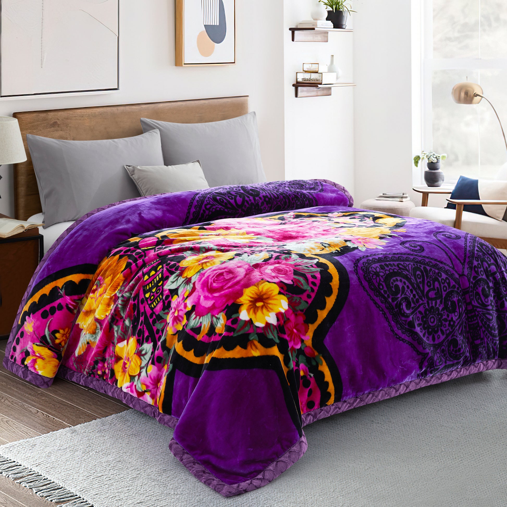Printed Reversible Woven Fluffy Plush Soft Warm Korean Style 2 Ply Flannel Fleece Throw Animal Mink Blanket, 86" x 94" Purple Butterfly Floral