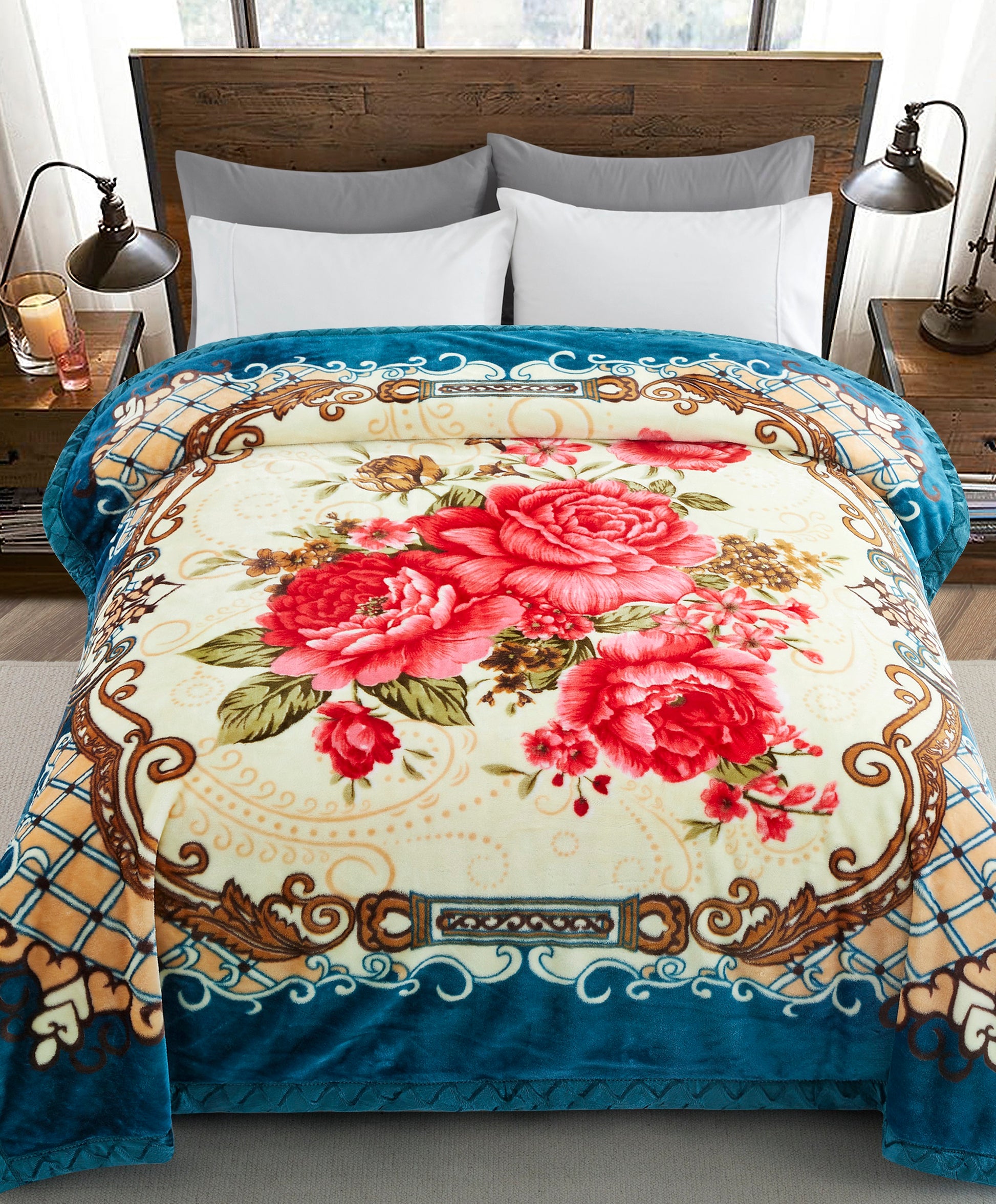 Printed Reversible Woven Fluffy Plush Soft Warm Korean Style 2 Ply Flannel Fleece Throw Mink Blanket, 78" x 86" Red Peony Turquoise Rose Floral