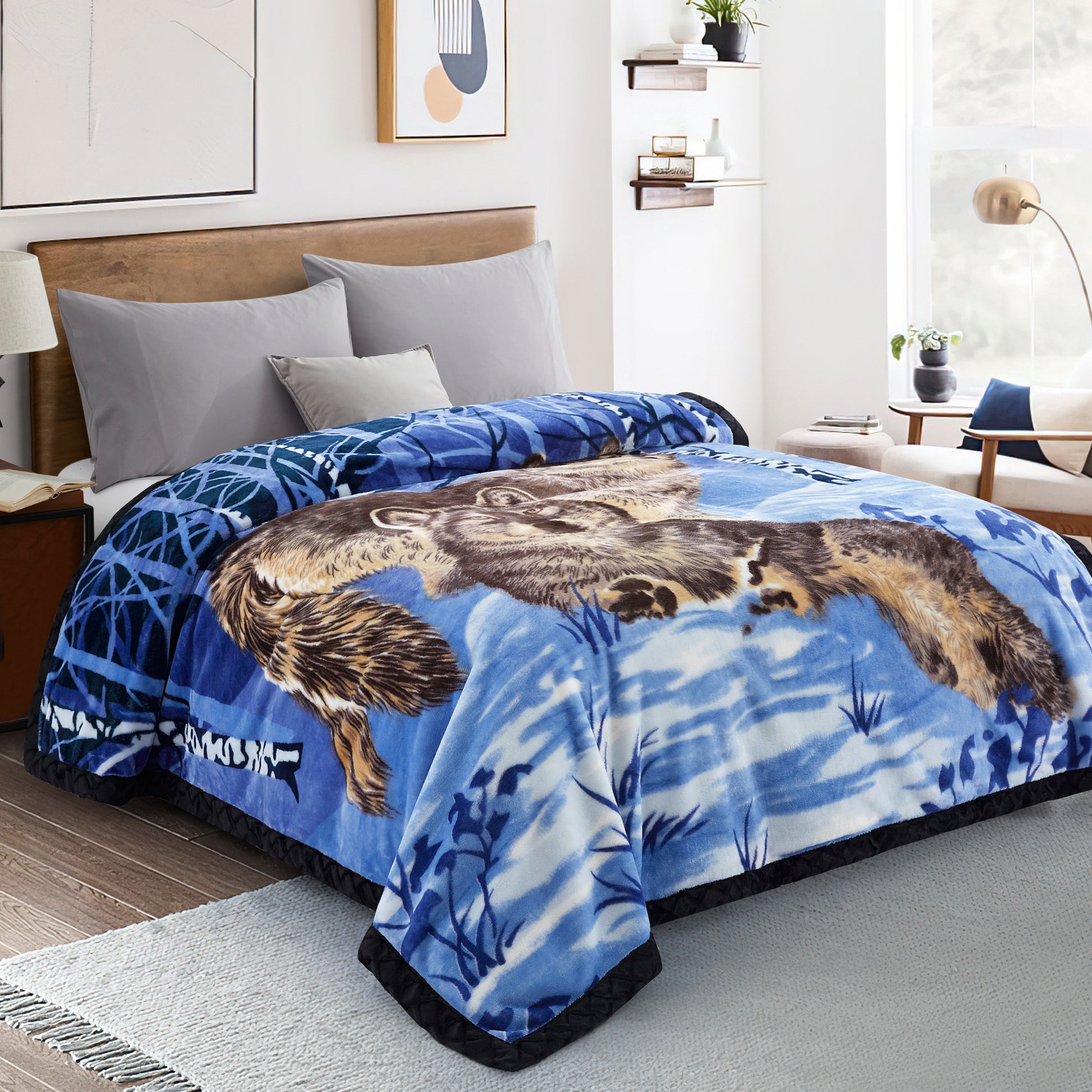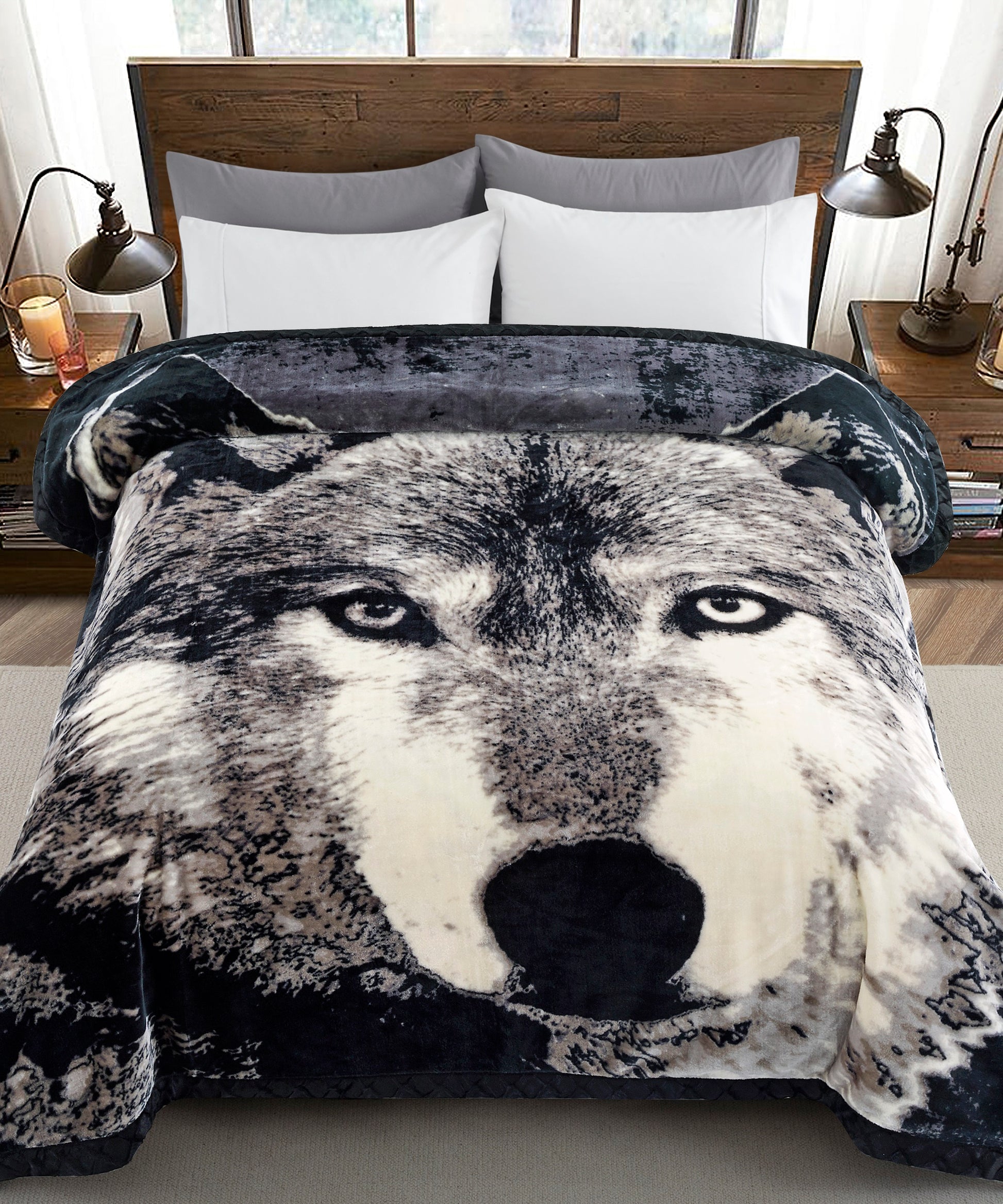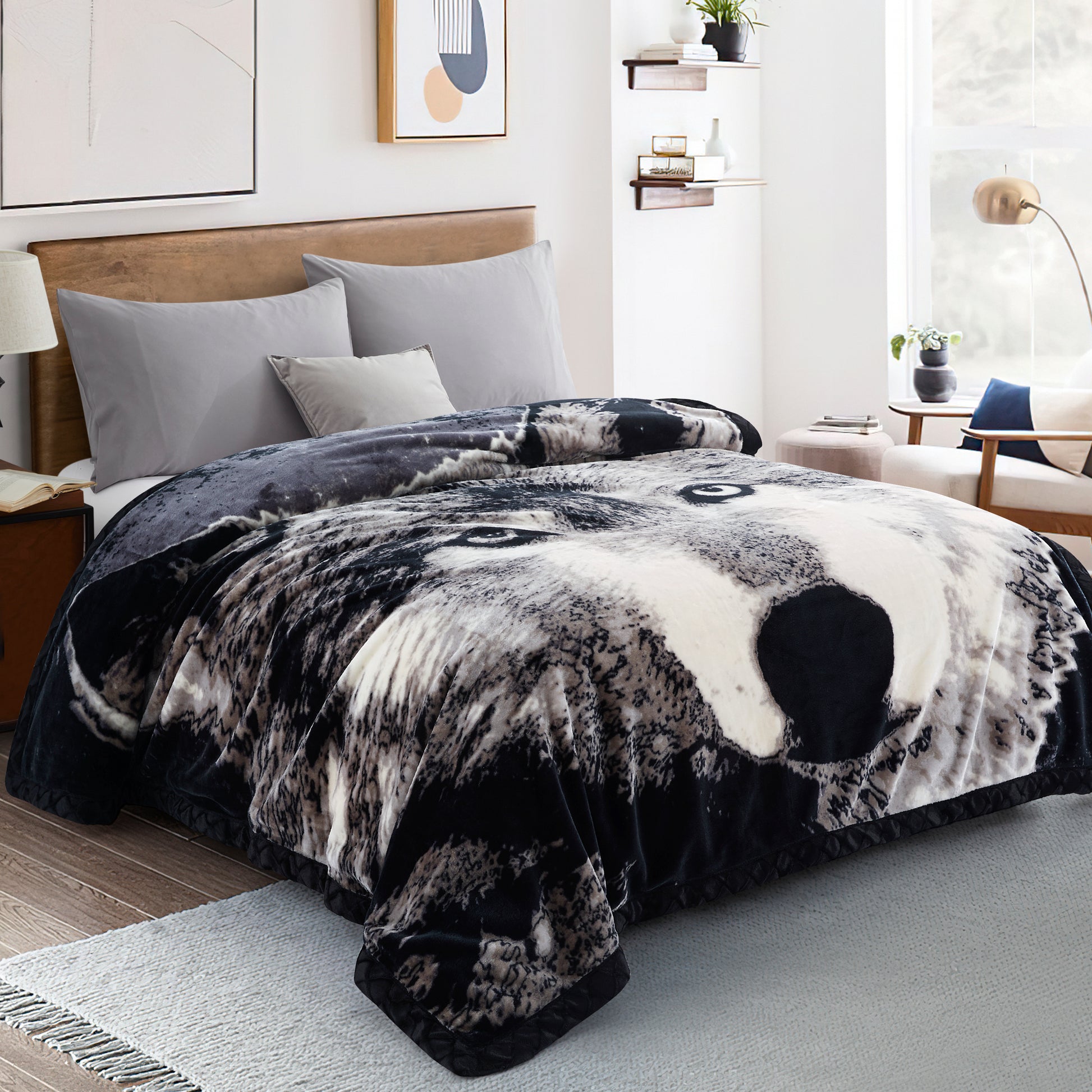 Printed Reversible Woven Fluffy Plush Soft Warm Korean Style 2 Ply Flannel Fleece Throw Animal Mink Blanket, 78" x 86" Wolf