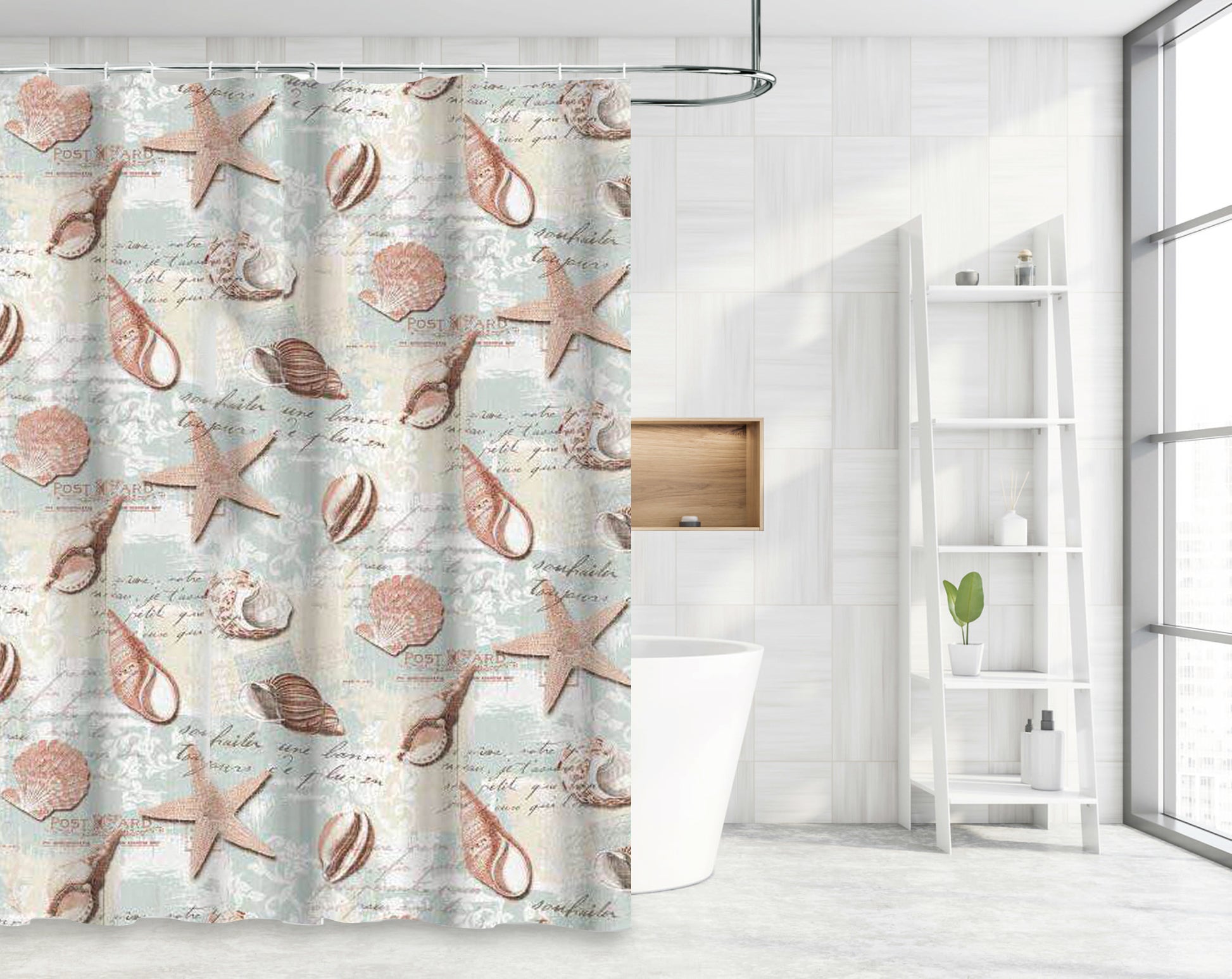 Waterproof Decor Printed Shower Curtain with Roller Hooks, Seashell and Starfish Pattern