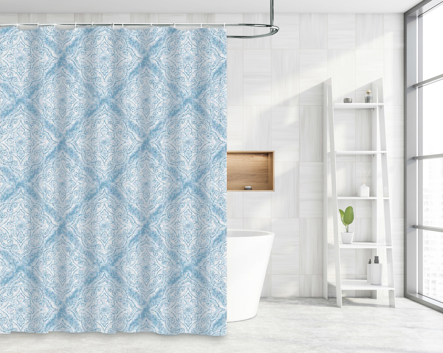 Waterproof Decor Printed Shower Curtain with Roller Hooks, Teal Damask Pattern